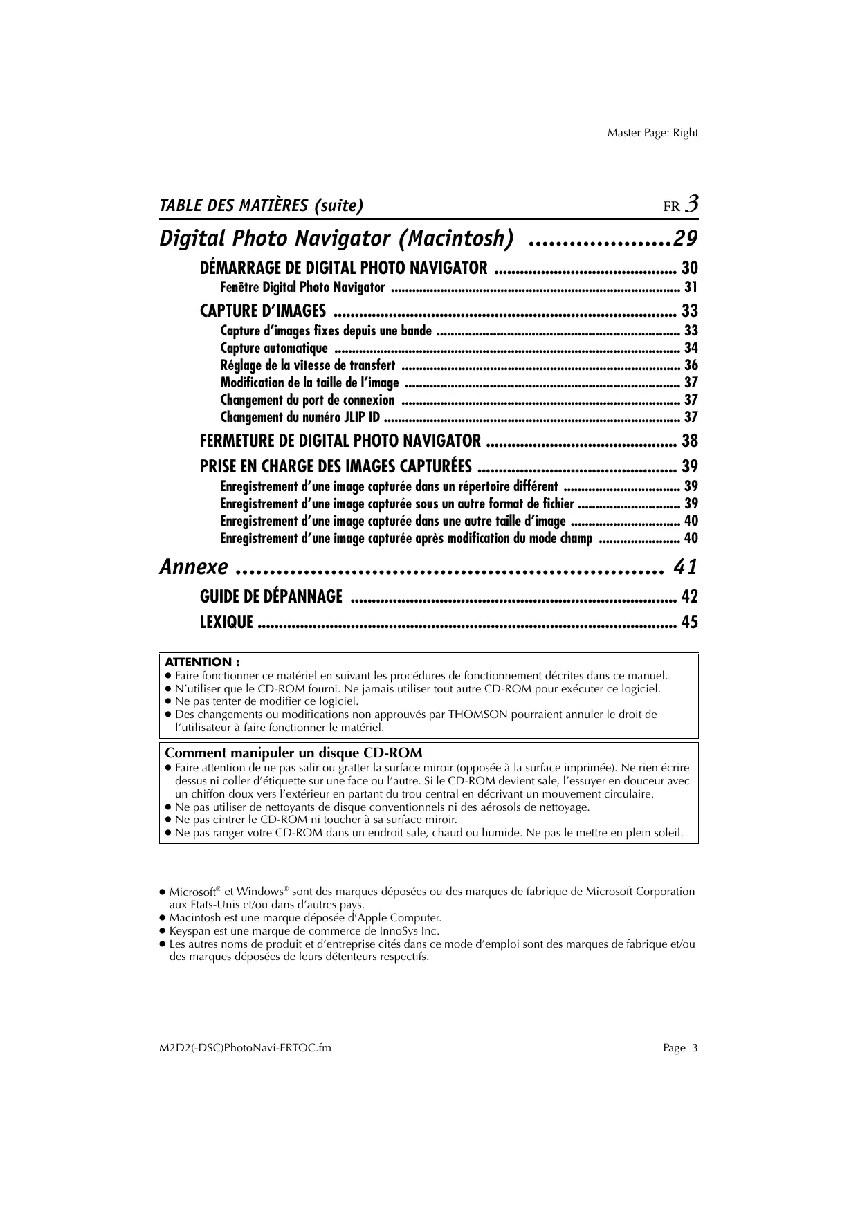 LEXIQUE ................................................................................................... 45 ATTENTION : ● Faire fonctionner ce matériel en suivant les procédures de fonctionnement décrites dans ce manuel. ● N’utiliser que le CD-ROM fourni. Ne jamais utiliser tout autre CD-ROM pour exécuter ce logiciel. ● Ne pas tenter de modifier ce logiciel. ● Des changements ou modifications non approuvés par THOMSON pourraient annuler le droit de l’utilisateur à faire fonctionner le matériel. Comment manipuler un disque CD-ROM ● Faire attention de ne pas salir ou gratter la surface miroir (opposée à la surface imprimée). Ne rien écrire dessus ni coller d’étiquette sur une face ou l’autre. Si le CD-ROM devient sale, l’essuyer en douceur avec un chiffon doux vers l’extérieur en partant du trou central en décrivant un mouvement circulaire. ● Ne pas utiliser de nettoyants de disque conventionnels ni des aérosols de nettoyage. ● Ne pas cintrer le CD-ROM ni toucher à sa surface miroir. ● Ne pas ranger votre CD-ROM dans un endroit sale, chaud ou humide. Ne pas le mettre en plein soleil. ● Microsoft® et Windows® sont des marques déposées ou des marques de fabrique de Microsoft Corporation aux Etats-Unis et/ou dans d’autres pays. ● Macintosh est une marque déposée d’Apple Computer. ● Keyspan est une marque de commerce de InnoSys Inc. ● Les autres noms de produit et d’entreprise cités dans ce mode d’emploi sont des marques de fabrique et/ou des marques déposées de leurs détenteurs respectifs. M2D2(-DSC)PhotoNavi-FRTOC.fm Page 3 Master Page: Left-Heading0 4 FR INTRODUCTION A propos de ce document Ce document est constitué des trois sections suivantes et d’une annexe. Avant toute utilisation, il est conseillé de lire le Guide d’installation. 䡲 Chargement d’images fixes (Windows®) Cette section explique comment capturer des images depuis la bande d’un caméscope vers un PC. Elle explique également le chargement d’images fixes dans l’album du logiciel Digital Photo Navigator. 䡲 Lecture et prise en charge des images (Windows®) Cette section explique la prise en charge d’images fixes à l’aide du logiciel Digital Photo Navigator. Vous pouvez envoyer des images fixes par courrier électronique et sauvegarder un album en tant que page Web. 䡲 Digital Photo Navigator (Macintosh) Cette section explique comment capturer des images depuis la bande d’un caméscope vers un PC. 䡲 Annexe Cette annexe contient le Guide de dépannage et l’index. M2D2(-DSC)PhotoNavi-FR.fm Page 4 Master Page: Right-SecCover