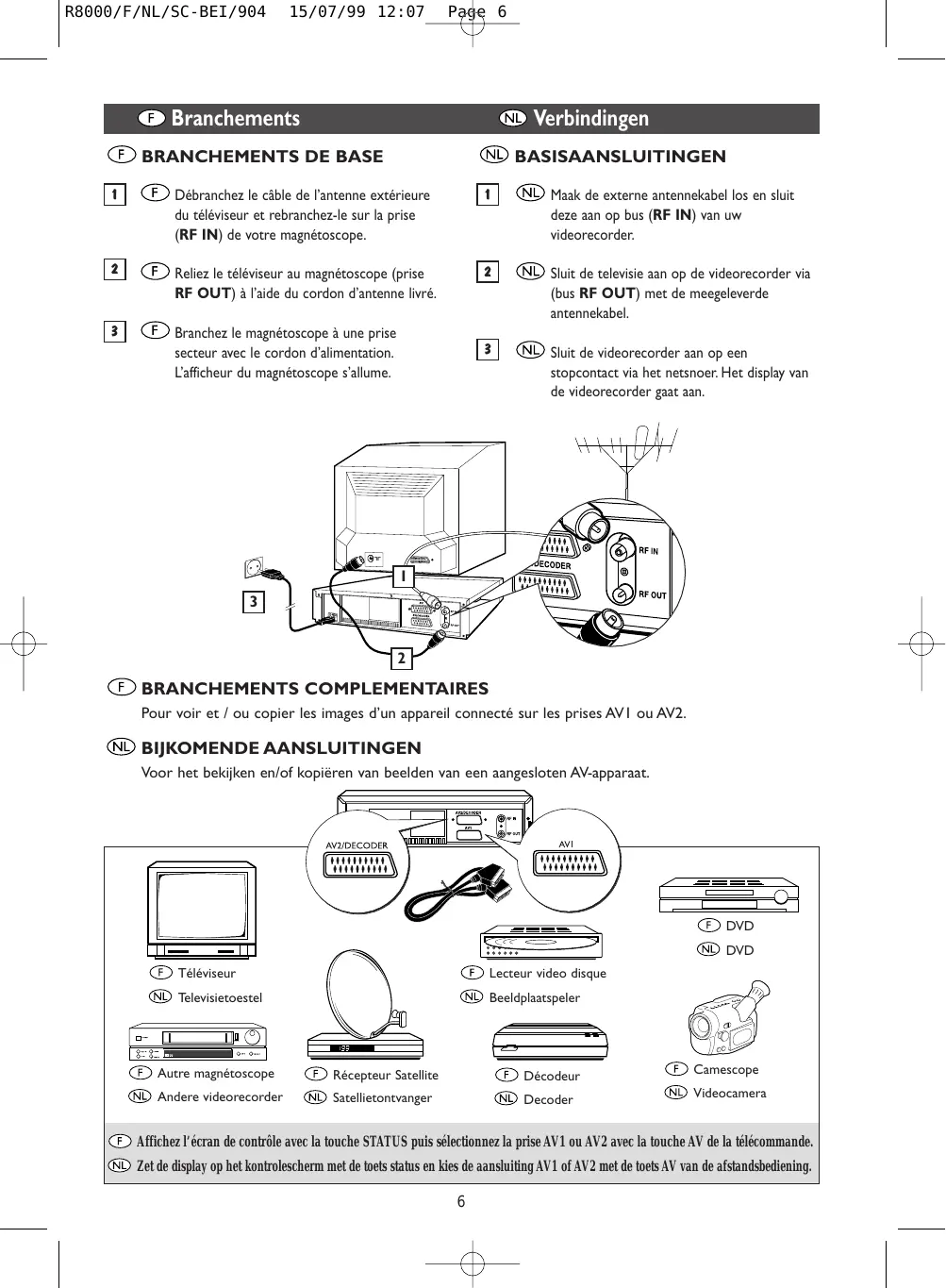 BRANCHEMENTS COMPLEMENTAIRES Pour voir et / ou copier les images d’un appareil connecté sur les prises AV1 ou AV2. BIJKOMENDE AANSLUITINGEN Voor het bekijken en/of kopiëren van beelden van een aangesloten AV-apparaat. DVD DVD Téléviseur Lecteur video disque Televisietoestel Beeldplaatspeler Autre magnétoscope Récepteur Satellite Décodeur Camescope Andere videorecorder Satellietontvanger Decoder Videocamera Affichez l’écran de contrôle avec la touche STATUS puis sélectionnez la prise AV1 ou AV2 avec la touche AV de la télécommande. Zet de display op het kontrolescherm met de toets status en kies de aansluiting AV1 of AV2 met de toets AV van de afstandsbediening.