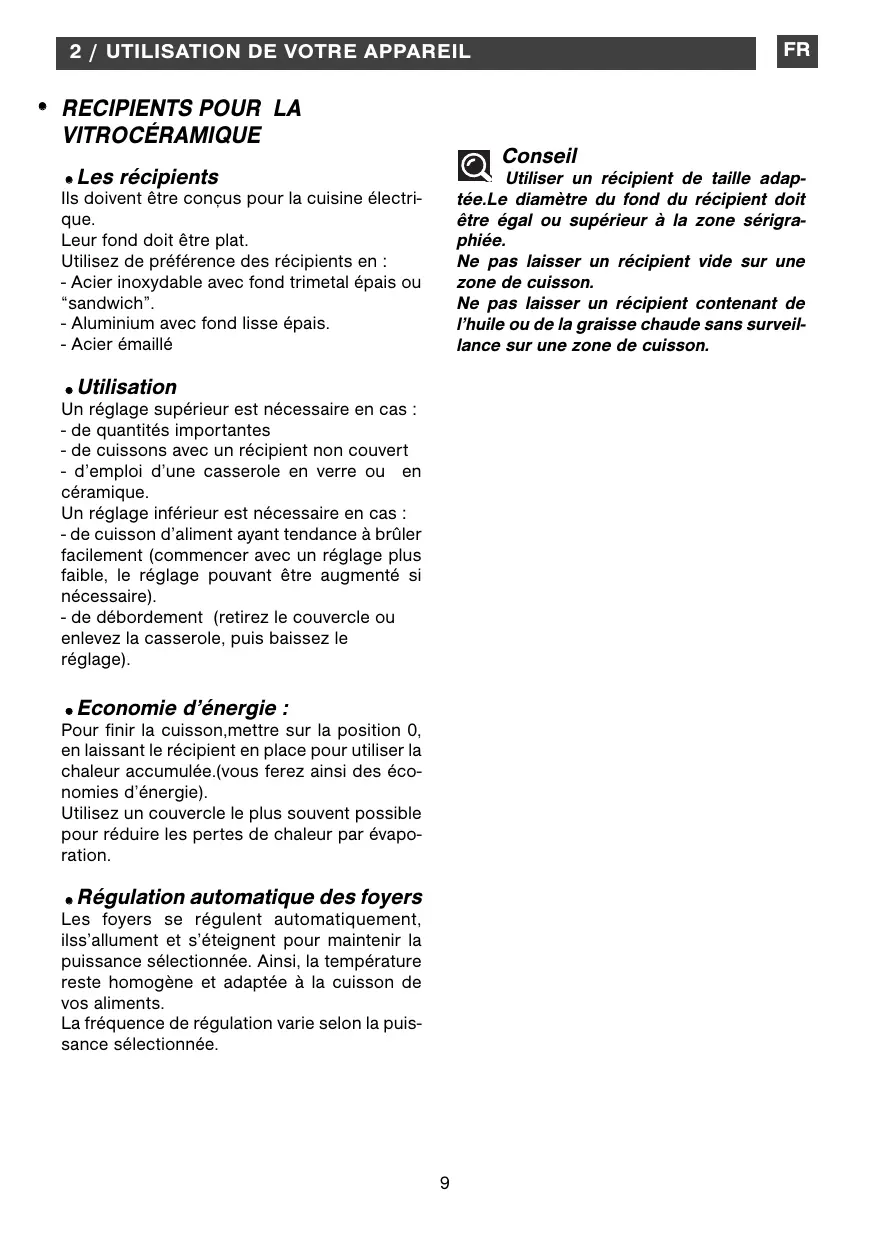 - Economie d’énergie : Pour finir la cuisson,mettre sur la position 0, en laissant le récipient en place pour utiliser la chaleur accumulée.(vous ferez ainsi des économies d’énergie). Utilisez un couvercle le plus souvent possible pour réduire les pertes de chaleur par évaporation.