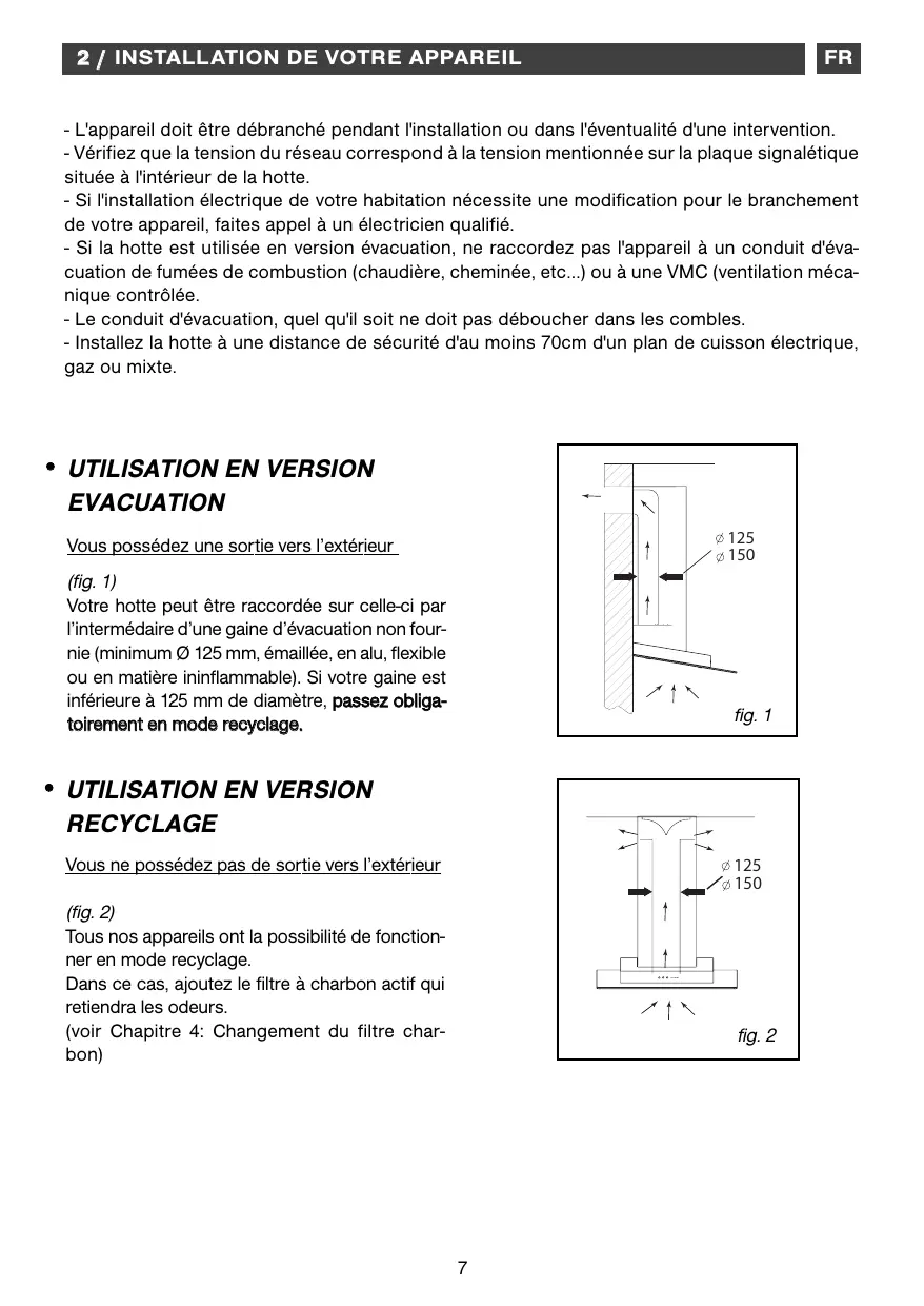 - L'appareil doit être débranché pendant l'installation ou dans l'éventualité d'une intervention. - Vérifiez que la tension du réseau correspond à la tension mentionnée sur la plaque signalétique située à l'intérieur de la hotte. - Si l'installation électrique de votre habitation nécessite une modification pour le branchement de votre appareil, faites appel à un électricien qualifié. - Si la hotte est utilisée en version évacuation, ne raccordez pas l'appareil à un conduit d'évacuation de fumées de combustion (chaudière, cheminée, etc…) ou à une VMC (ventilation mécanique contrôlée. - Le conduit d'évacuation, quel qu'il soit ne doit pas déboucher dans les combles. - Installez la hotte à une distance de sécurité d'au moins 70cm d'un plan de cuisson électrique, gaz ou mixte.