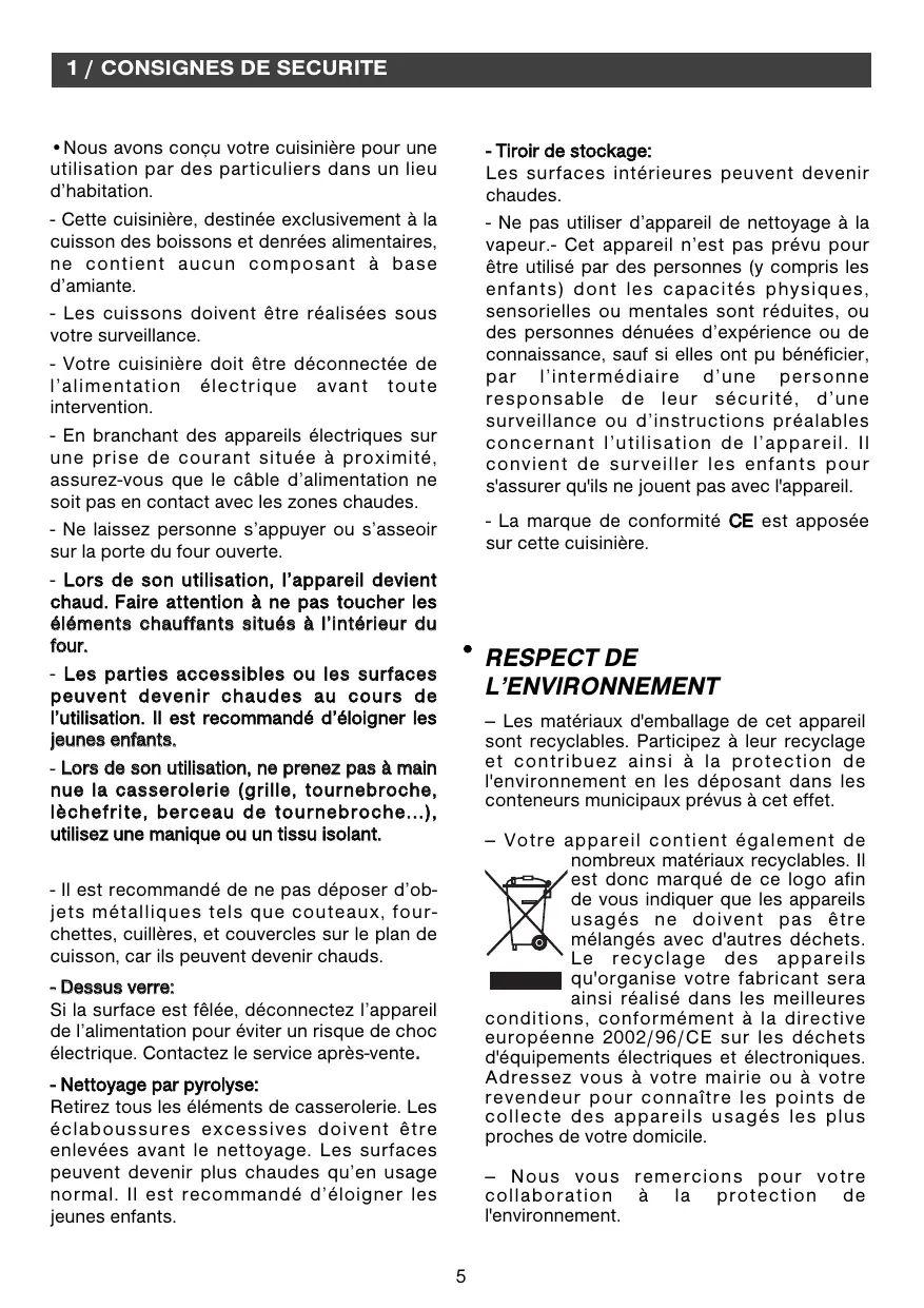 • Nous avons conçu votre cuisinière pour une utilisation par des particuliers dans un lieu d’habitation. - Cette cuisinière, destinée exclusivement à la cuisson des boissons et denrées alimentaires, ne contient aucun composant à base d’amiante. - Les cuissons doivent être réalisées sous votre surveillance. - Votre cuisinière doit être déconnectée de l’alimentation électrique avant toute intervention. - En branchant des appareils électriques sur une prise de courant située à proximité, assurez-vous que le câble d’alimentation ne soit pas en contact avec les zones chaudes. - Ne laissez personne s’appuyer ou s’asseoir sur la porte du four ouverte. - Lors de son utilisation, l’appareil devient chaud. F a i r e a t t e n t i o n à n e p a s t o u c h e r l e s éléments chauffants situés à l’intérieur du four. - Les parties accessibles ou les surfaces peuvent devenir chaudes au cours de l’utilisation. Il est recommandé d’éloigner les jeunes enfants. - Lors de son utilisation, ne prenez pas à main nue la casserolerie (grille, tournebroche, lèchefrite, berceau de tournebroche...), utilisez une manique ou un tissu isolant. - Tiroir de stockage: Les surfaces intérieures peuvent devenir chaudes. - Ne pas utiliser d’appareil de nettoyage à la vapeur.- Cet appareil n’est pas prévu pour être utilisé par des personnes (y compris les enfants) dont les capacités physiques, sensorielles ou mentales sont réduites, ou des personnes dénuées d’expérience ou de connaissance, sauf si elles ont pu bénéficier, par l’intermédiaire d’une personne responsable de leur sécurité, d’une surveillance ou d’instructions préalables concernant l’utilisation de l’appareil. Il convient de surveiller les enfants pour s'assurer qu'ils ne jouent pas avec l'appareil. - La marque de conformité CE est apposée sur cette cuisinière.