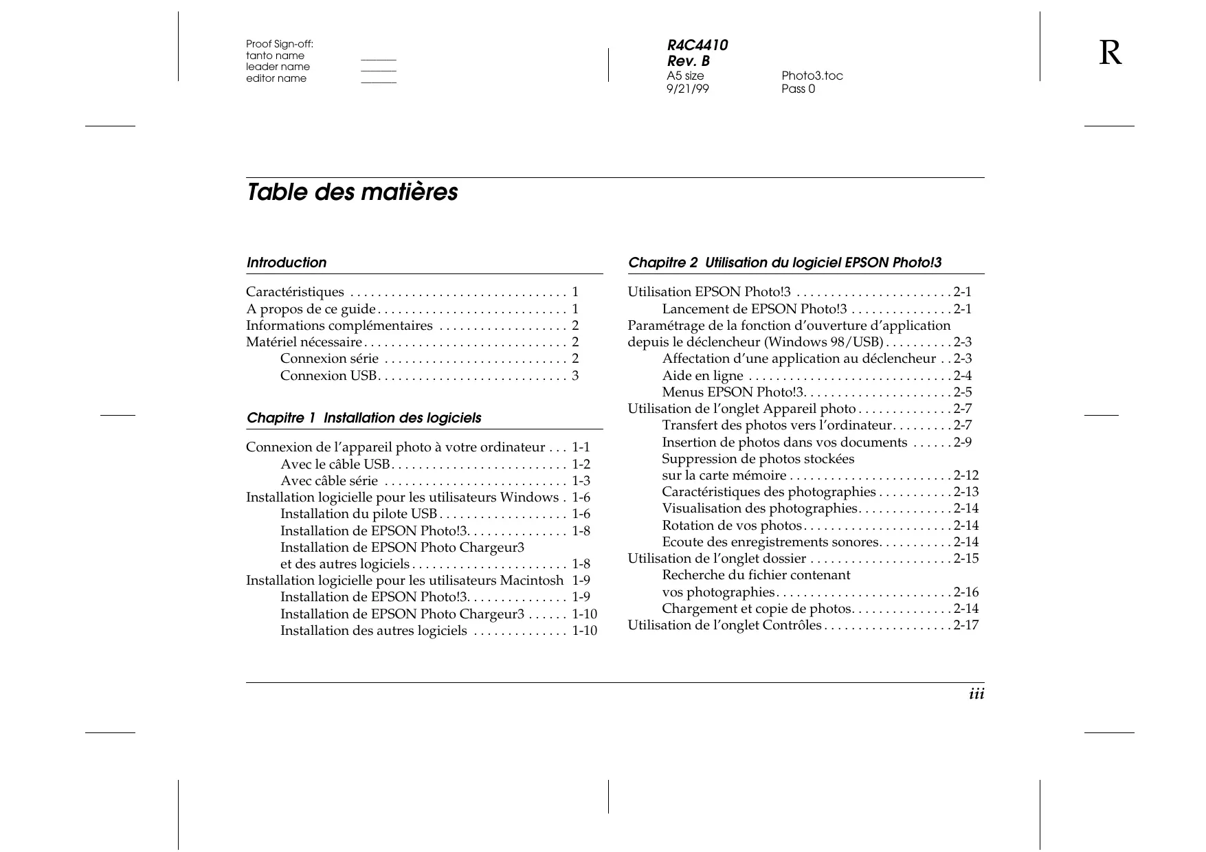 A5 size 9/21/99 Photo3.toc Pass 0 Table des matières Introduction Caractéristiques ... A propos de ce guide ... Informations complémentaires ... Matériel nécessaire ... Connexion série ... Connexion USB...