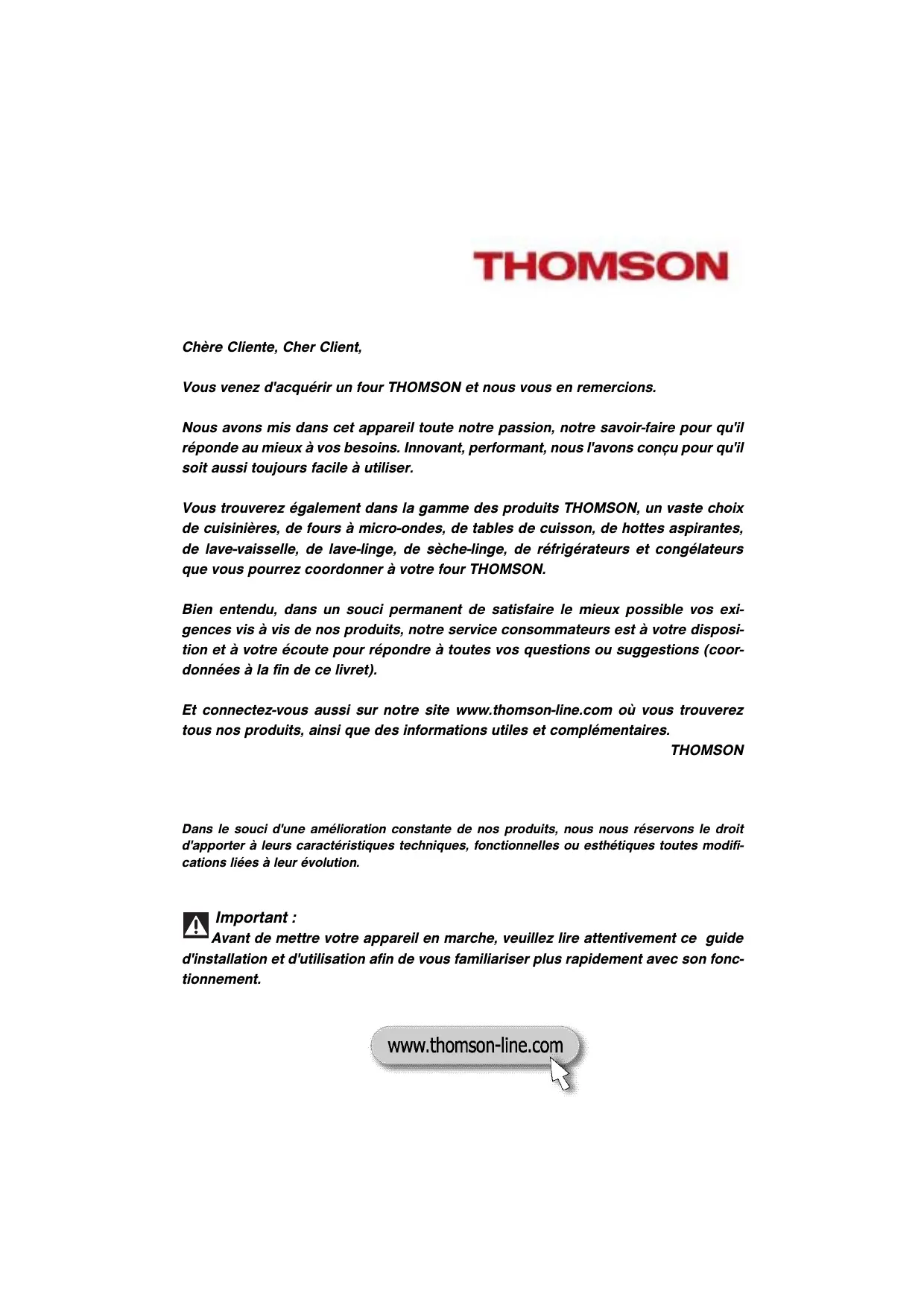 DE BETRIEBSANLEITUNG Four à micro ondes Microwave Oven Mikrowellengerät Chère Cliente, Cher Client, Vous venez d'acquérir un four THOMSON et nous vous en remercions. Nous avons mis dans cet appareil toute notre passion, notre savoir-faire pour qu'il réponde au mieux à vos besoins. Innovant, performant, nous l'avons conçu pour qu'il soit aussi toujours facile à utiliser. Vous trouverez également dans la gamme des produits THOMSON, un vaste choix de cuisinières, de fours à micro-ondes, de tables de cuisson, de hottes aspirantes, de lave-vaisselle, de lave-linge, de sèche-linge, de réfrigérateurs et congélateurs que vous pourrez coordonner à votre four THOMSON. Bien entendu, dans un souci permanent de satisfaire le mieux possible vos exigences vis à vis de nos produits, notre service consommateurs est à votre disposition et à votre écoute pour répondre à toutes vos questions ou suggestions (coordonnées à la fin de ce livret). Et connectez-vous aussi sur notre site www.thomson-line.com où vous trouverez tous nos produits, ainsi que des informations utiles et complémentaires. THOMSON Dans le souci d'une amélioration constante de nos produits, nous nous réservons le droit d'apporter à leurs caractéristiques techniques, fonctionnelles ou esthétiques toutes modifications liées à leur évolution. Important : Avant de mettre votre appareil en marche, veuillez lire attentivement ce guide d'installation et d'utilisation afin de vous familiariser plus rapidement avec son fonctionnement.