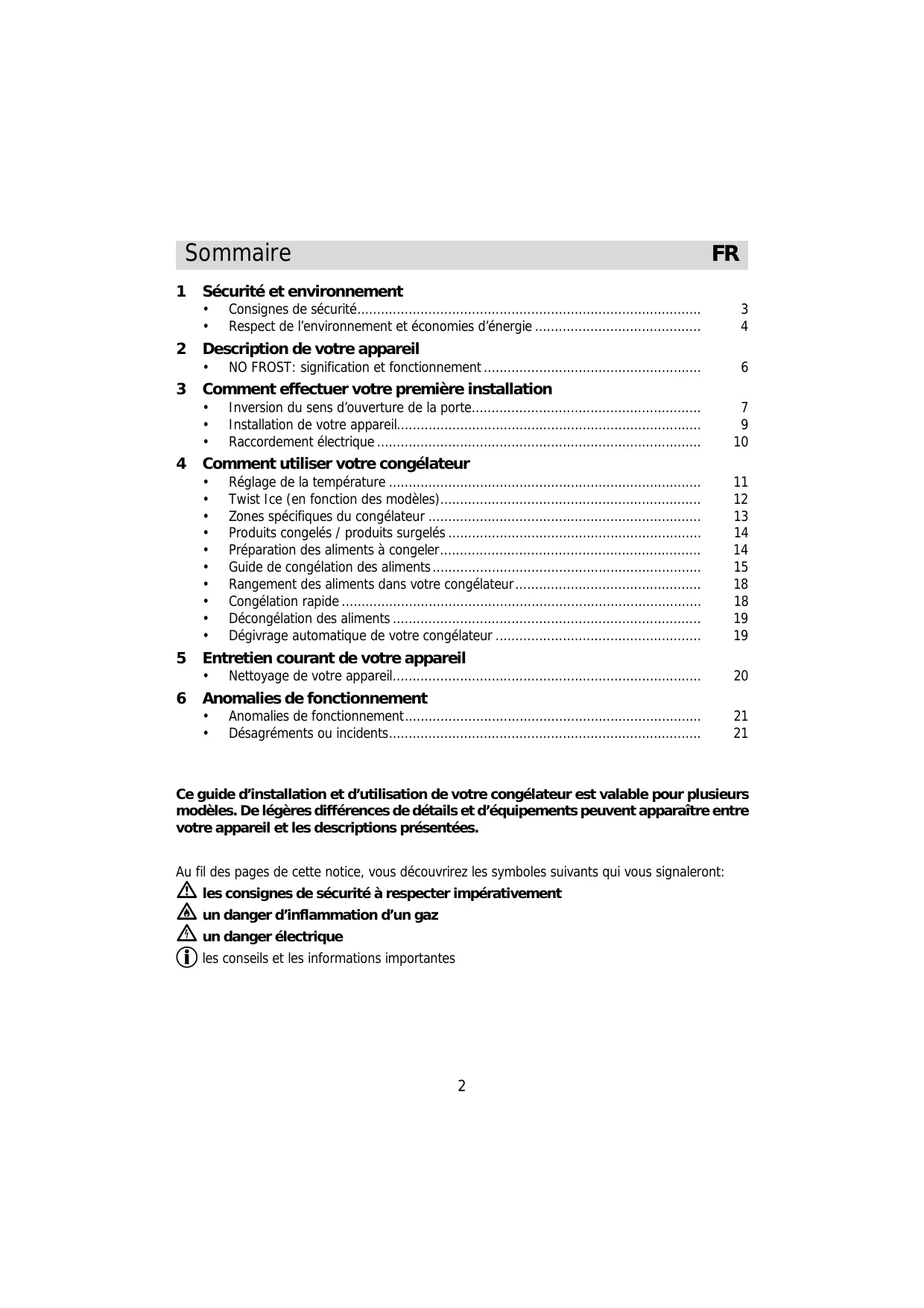 Ce guide d’installation et d’utilisation de votre congélateur est valable pour plusieurs modèles. De légères différences de détails et d’équipements peuvent apparaître entre votre appareil et les descriptions présentées. Au fil des pages de cette notice, vous découvrirez les symboles suivants qui vous signaleront: les consignes de sécurité à respecter impérativement un danger d’inflammation d’un gaz un danger électrique les conseils et les informations importantes