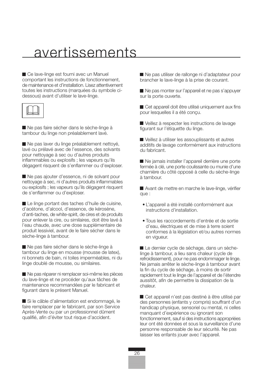 To highlight the obligation of collaborating with selective waste collection, the product is marked with a symbol to warn against using traditional containers for disposing of the appliance. For further information, contact your local authority or the shop where you purchased the product. avertissements Ce lave-linge est fourni avec un Manuel comportant les instructions de fonctionnement, de maintenance et d’installation. Lisez attentivement toutes les instructions (marquées du symbole cidessous) avant d’utiliser le lave-linge. Ne pas utiliser de rallonge ni d’adaptateur pour brancher le lave-linge à la prise de courant. Ne pas monter sur l’appareil et ne pas s’appuyer sur la porte ouverte.