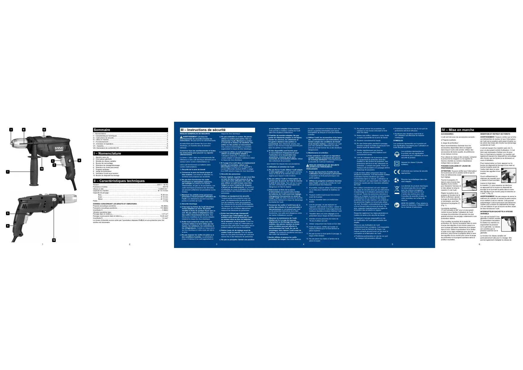 et instructions peut donner lieu à un choc électrique, un incendie et/ou de blessure sérieuse. Le terme « outil » dans les avertissements fait référence à votre outil électrique alimenté par le secteur (avec cordon d’alimentation) ou Tension……………………………………..………………………………………………...... 230 V ~ 50 Hz Puissance d’entrée……………………..……………………………………………………......……..600 W Vitesse à vide .......……………………..……………………………………………………..... 0-2900 min-1 &DSDFLWpGXPDQGULQ««««««««««««««««««««««««««ĭPP Capacité de perçage : %RLV««««««««««««««««««««««««««««««««ĭPP $FLHU«««««««««««««««««««««««««««««««ĭPP %pWRQ«««««««««««««««««««««««««««««««ĭPP Poids .........................................………………..………………………………………………........ 2.2 kg