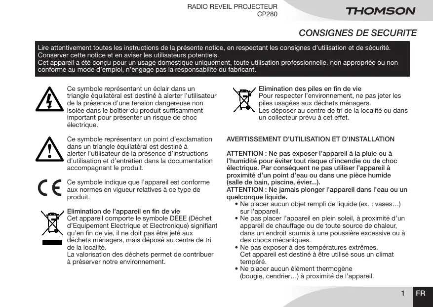Lire attentivement toutes les instructions de la présente notice, en respectant les consignes d’utilisation et de sécurité. Conserver cette notice et en aviser les utilisateurs potentiels. Cet appareil a été conçu pour un usage domestique uniquement, toute utilisation professionnelle, non appropriée ou non conforme au mode d’emploi, n’engage pas la responsabilité du fabricant. Ce symbole représentant un éclair dans un triangle équilatéral est destiné à alerter l’utilisateur de la présence d’une tension dangereuse non isolée dans le boîtier du produit suffisamment important pour présenter un risque de choc électrique. Ce symbole représentant un point d’exclamation dans un triangle équilatéral est destiné à alerter l’utilisateur de la présence d’instructions d’utilisation et d’entretien dans la documentation accompagnant le produit. Ce symbole indique que l’appareil est conforme aux normes en vigueur relatives à ce type de produit. Elimination de l’appareil en fin de vie Cet appareil comporte le symbole DEEE (Déchet d’Equipement Electrique et Electronique) signifiant qu’en fin de vie, il ne doit pas être jeté aux déchets ménagers, mais déposé au centre de tri de la localité. La valorisation des déchets permet de contribuer à préserver notre environnement. Elimination des piles en fin de vie Pour respecter l’environnement, ne pas jeter les piles usagées aux déchets ménagers. Les déposer au centre de tri de la localité ou dans un collecteur prévu à cet effet.
