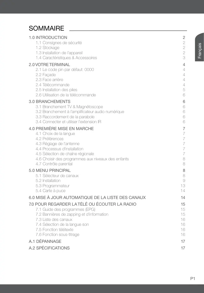 A.1 Dépannage Cause Recours Les LED de la façade ne s’allument pas. Symptôme Le cordon d’alimentation n’est pas branché. L’interrupteur de la face arrière est en position OFF. Vérifiez que le cordon d’alimentation est bien branché dans la prise murale. Vérifiez que l’interrupteur de la face arrière est en position ON. Pas d’image ou de son. Mauvais branchement de la sortie Audio/Vidéo du terminal au téléviseur. Branchez correctement la sortie A/V du terminal au téléviseur. Son coupé. Appuyez sur la touche SOURDINE. TV hors tension. Allumez le téléviseur. Le terminal ne reçoit pas de signal. Vérifiez le câble d’antenne ; le remplacer ou resserrez sa connexion au terminal. Valeurs incorrectes pour certains paramètres du tuner. Dans le menu Installation, régler correctement les valeurs des paramètres du tuner. Mauvaise orientation de la parabole. Vérifiez la puissance du signal et orientez correctement la parabole. Il n’y a pas de piles dans la télécommande, ou les piles sont à plat. Vérifiez que les piles soient correctement insérées dans la télécommande. Vérifiez les piles ; si elles sont à plat, les remplacer. Pas d’image. La télécommande ne fonctionne pas. Français Un dysfonctionnement du terminal peut avoir de multiples causes. Vérifiez l'appareil comme indiqué ci-dessous. S'il ne fonctionne toujours pas correctement après contrôle, contactez votre revendeur. Ne pas ouvrir le capot du terminal, cela peut être dangereux. A.2 Spécifications Démodulateur Modulation: Modulation par déplacement de phase quadrivalente Vitesse de saisie: 2 ~ 45 Ms/s Signaux SCPC ou MCPC depuis les bandes satellites KU Sortie vidéo Niveau profil: MPEG-2 MP@ML Vitesse d'entrée: 60 Mo/s max. Résolution vidéo: 720 x 576 (PAL & SECAM) Rapport hauteur/largeur: 4:3, 16:9 Sortie audio MPEG-1 layer I et 2, MPEG-2 Cadence d'échantillonnage: 32, 44.1, 48 kHz Modes: Stéréo, Canal double P17 DÉPANNAGE Syntoniseur Frontal: DVB-S Gamme des fréquences d'entrée: 950 ~ 2150 MHz Niveau d'entrée RF: -25 ~ -65 dBm Puissance LNB: 13,5/18,5 V DC (+/- 5 %), 400 mA max., protection contre les surcharges Versions DiSEqC: 1.0 Mémoire et système Processeur: STi5189 @ 350 MHz Mémoire flash: 4 Mbytes DDR SRAM: 64 Mbytes Connecteurs Entrée SAT; Sortie SAT 2 péritels TV (RGB, CVBS)/VCR (CVBS) 3 RCA (Audio G et D, Vidéo) S/PDIF: Sortie «co-axiale» IR IN Données générales Gamme des tensions d'entrée: 100 – 240 V AC 50/60 Hz Consommation: 20 W max Consommation en veille: 2.00 W Température de fonctionnement: 0 ~ +40 °C Température de stockage: -30 ~ +80 °C Gamme des humidités de fonctionnement: