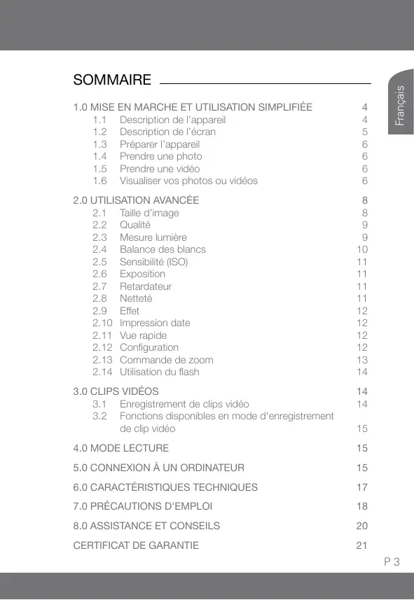 MENU Vue rapide Grâce à cette option (activée par défaut), vous pouvez voir la photo que vous venez de prendre sur l’écran LCD pendant une durée de 2 secondes. L’aperçu rapide n’est possible qu’avec les photos. Le menu Configuration contient les options suivantes : Sons P 12 Permet d’activer ou de désactiver le bip sonore, de modifier le son de démarrage mais aussi d’activer ou désactiver le son lors de la prise de vue. Utilisation avancée Réglez le délai au bout duquel l’appareil photo s’éteint afin d’économiser la batterie. Français Extinction auto Langue/Language Sélectionnez la langue d’affichage des menus de l’appareil photo. Date/Heure Vous permet de régler la date, l’heure et le format de date. NOTE : la date et l’heure sont imprimées sur les photos si vous activez l’impression de la date (voir § 2.10 page 12) et permettent de dater les photos (fichiers .jpg et données EXIF). Si vous souhaitez dater vos photos, notez qu’il est nécessaire de régler la date après chaque ouverture de l’accès aux piles ou à la carte. Formatage de la carte Pour formater la carte mémoire ou la mémoire interne. Attention, cette opération efface toutes les données présentes sur la carte. Réinitialisation Restaurez les valeurs par défaut des réglages de l’appareil photo.