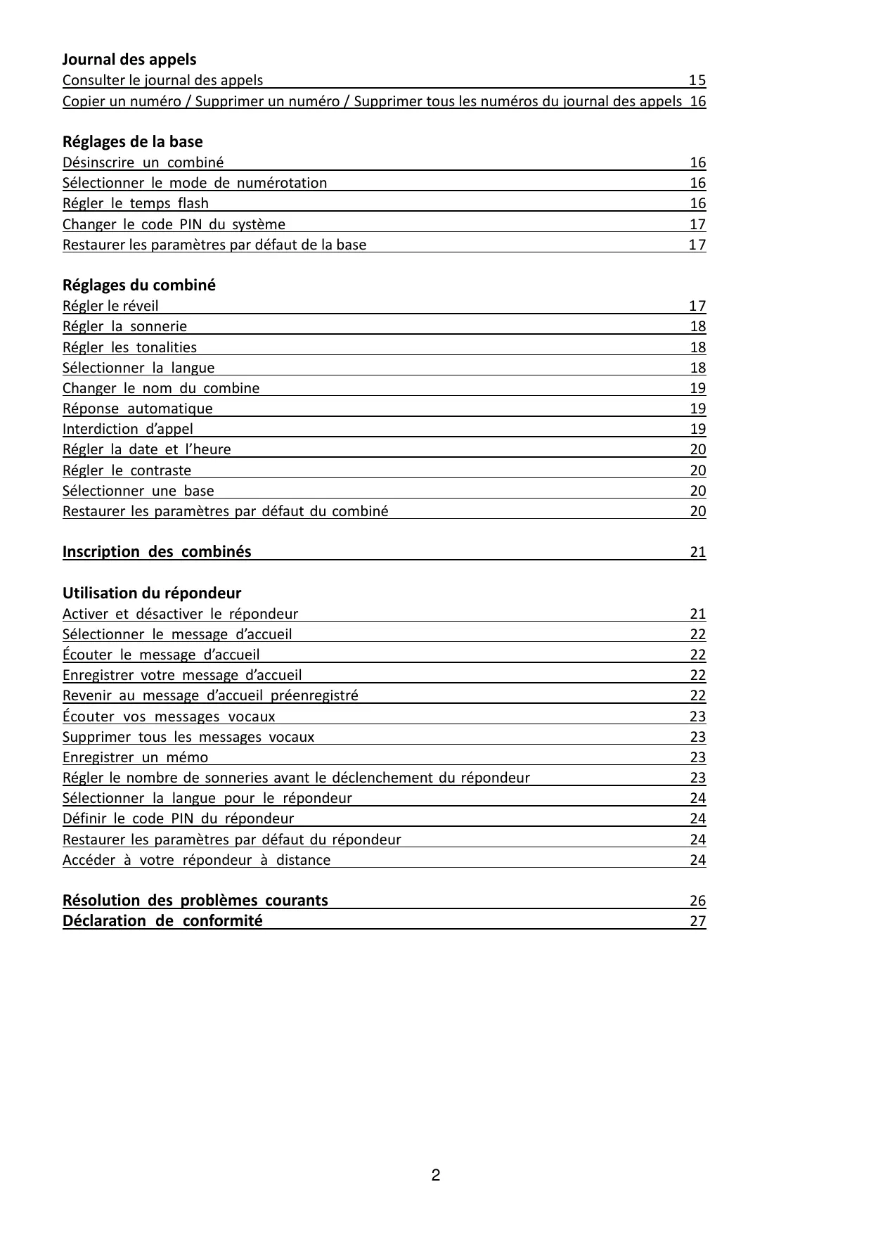 Journal des appels Consulter le journal des appels Copier un numéro / Supprimer un numéro / Supprimer tous les numéros du journal des appels 16 Réglages de la base Désinscrire un combiné Sélectionner le mode de numérotation Régler le temps flash Changer le code PIN du système Restaurer les paramètres par défaut de la base