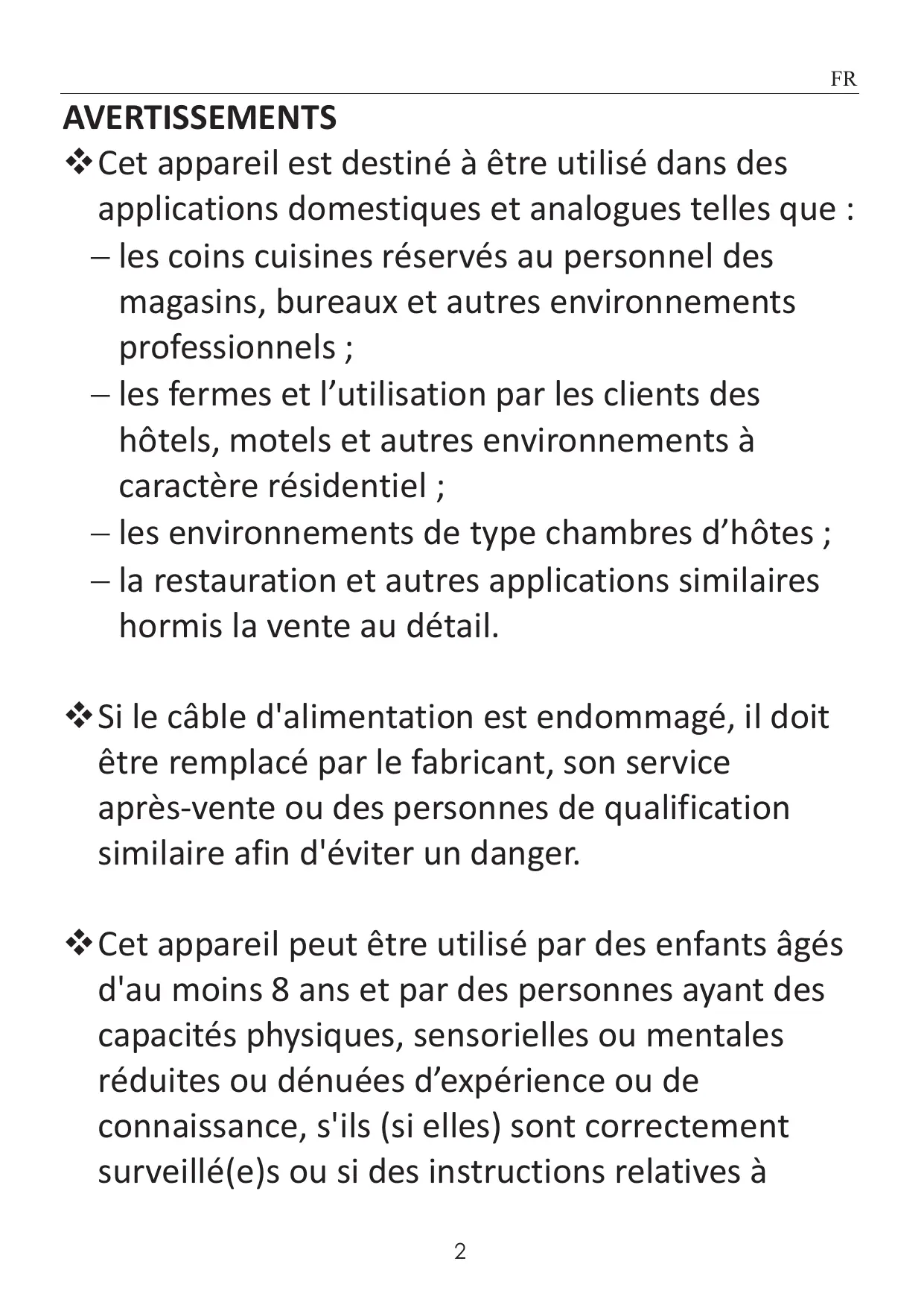 AVERTISSEMENTS Cet appareil est destiné à être utilisé dans des applications domestiques et analogues telles que : les coins cuisines réservés au personnel des magasins, bureaux et autres environnements professionnels ; les fermes et l’utilisation par les clients des hôtels, motels et autres environnements à caractère résidentiel ; les environnements de type chambres d’hôtes ; la restauration et autres applications similaires hormis la vente au détail. Si le câble d'alimentation est endommagé, il doit être remplacé par le fabricant, son service après-vente ou des personnes de qualification similaire afin d'éviter un danger. Cet appareil peut être utilisé par des enfants âgés d'au moins 8 ans et par des personnes ayant des capacités physiques, sensorielles ou mentales réduites ou dénuées d’expérience ou de connaissance, s'ils (si elles) sont correctement surveillé(e)s ou si des instructions relatives à