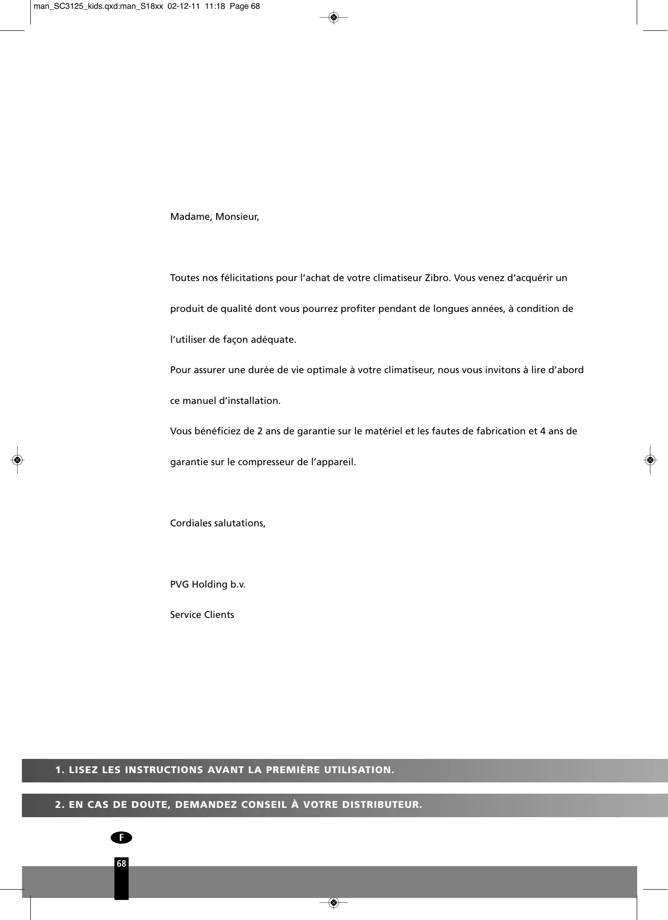 • Ce climatiseur contient un réfrigérant et peut être classé comme équipement pressurisé. A ce titre, il est obligatoire de faire installer et entretenir son appareil par un professionnel agréé. Le climatiseur doit être inspecté et entretenu par un professionnel agréé une fois par an. La garantie ne couvre pas les dégâts causés par une utilisation ne respectant pas le mode d’emploi, ou suite à des négligences.
