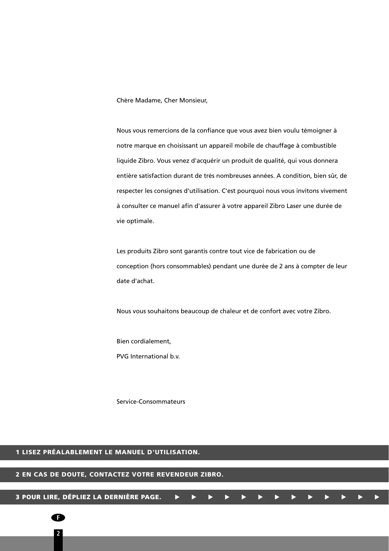Chère Madame, Cher Monsieur, Nous vous remercions de la confiance que vous avez bien voulu témoigner à notre marque en choisissant un appareil mobile de chauffage à combustible liquide Zibro. Vous venez d'acquérir un produit de qualité, qui vous donnera entière satisfaction durant de très nombreuses années. A condition, bien sûr, de respecter les consignes d'utilisation. C'est pourquoi nous vous invitons vivement à consulter ce manuel afin d'assurer à votre appareil Zibro Laser une durée de vie optimale. Les produits Zibro sont garantis contre tout vice de fabrication ou de conception (hors consommables) pendant une durée de 2 ans à compter de leur date d'achat. Nous vous souhaitons beaucoup de chaleur et de confort avec votre Zibro. 3 POUR LIRE, DÉPLIEZ LA DERNIÈRE PAGE.