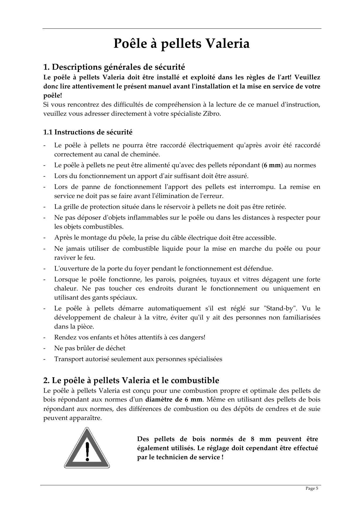 Le poêle à pellets Valeria doit être installé et exploité dans les règles de lʹart! Veuillez donc lire attentivement le présent manuel avant lʹinstallation et la mise en service de votre poêle! Si vous rencontrez des difficultés de compréhension à la lecture de ce manuel dʹinstruction, veuillez vous adresser directement à votre spécialiste Zibro.