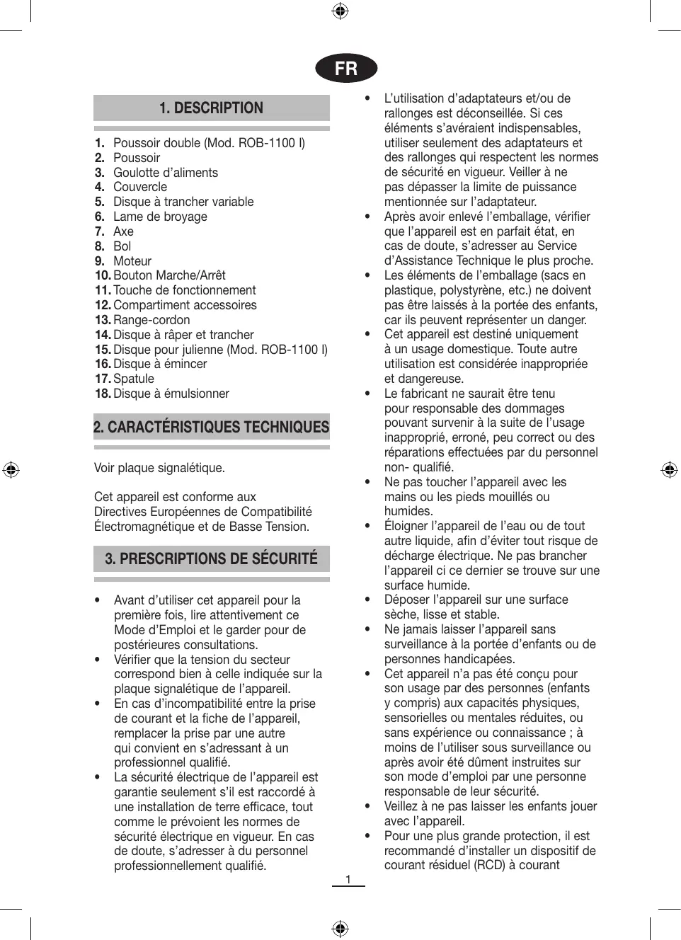 résiduel opérationnel ne dépassant pas les 30 mA. Consultez votre installateur. Ne pas abandonner l’appareil allumé, car il peut représenter une source de danger. Pour débrancher la fiche, ne jamais tirer sur le cordon. Débrancher l’appareil avant d’effectuer toute opération de nettoyage ou de maintenance. En cas de panne et/ou de mauvais fonctionnement de l’appareil, éteindre ce dernier et ne pas essayer de le réparer. S’il requiert une réparation, s’adresser uniquement à un Service d’Assistance Technique agréé par le fabricant et demander à utiliser des pièces de rechange originales. Si le cordon de l’appareil est endommagé, s’adresser à un Service d’Assistance Technique agréé par le fabricant pour le faire remplacer. Ne pas le laisser cet appareil exposé aux intempéries (pluie, soleil, givre, etc.). Ne pas utiliser l’appareil et ne placer aucune de ses parties sur des surfaces chaudes ou près de celles-ci (plaques de cuisson à gaz ou électriques ou fours). Ne pas utiliser de produits abrasifs pour nettoyer l’appareil. Ne pas toucher les parties chaudes de l’appareil. Saisir toujours l’appareil par la poignée. Éviter que le cordon ne touche les parties chaudes de l’appareil. Manipulez les lames et les disques avec précaution, car ils sont très tranchants. Débranchez l’appareil avant de retirer ou de changer les lames. Attendre que les lames aient cessé de tourner pour enlever le couvercle. Saisissez toujours les lames et les disques par la tige, pour éviter de vous couper. Débranchez l’appareil avant d’installer ou de retirer les accessoires, avant de procéder à une quelconque opération d’entretien et lorsque vous n’utilisez pas l’appareil. Ne pas verser de liquides chauds dans le bol. Ne pas faire fonctionner l’appareil en continu durant plus de 4 minutes.