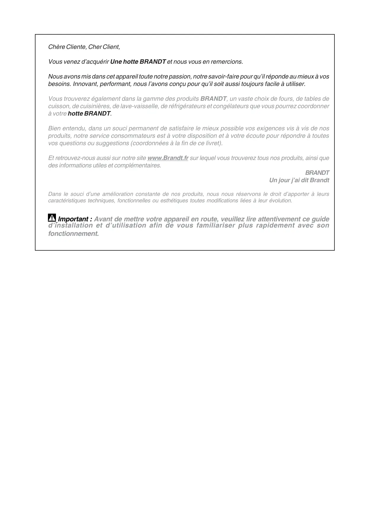 Hotte de cuisine Chère Cliente, Cher Client, Vous venez d’acquérir Une hotte BRANDT et nous vous en remercions. Nous avons mis dans cet appareil toute notre passion, notre savoir-faire pour qu’il réponde au mieux à vos besoins. Innovant, performant, nous l’avons conçu pour qu’il soit aussi toujours facile à utiliser. Vous trouverez également dans la gamme des produits BRANDT, un vaste choix de fours, de tables de cuisson, de cuisinières, de lave-vaisselle, de réfrigérateurs et congélateurs que vous pourrez coordonner à votre hotte BRANDT. Bien entendu, dans un souci permanent de satisfaire le mieux possible vos exigences vis à vis de nos produits, notre service consommateurs est à votre disposition et à votre écoute pour répondre à toutes vos questions ou suggestions (coordonnées à la fin de ce livret). Et retrouvez-nous aussi sur notre site www.Brandt.fr sur lequel vous trouverez tous nos produits, ainsi que des informations utiles et complémentaires. BRANDT Un jour j’ai dit Brandt Dans le souci d’une amélioration constante de nos produits, nous nous réservons le droit d’apporter à leurs caractéristiques techniques, fonctionnelles ou esthétiques toutes modifications liées à leur évolution. Important : Avant de mettre votre appareil en route, veuillez lire attentivement ce guide d’installation et d’utilisation afin de vous familiariser plus rapidement avec son fonctionnement. Les descriptions et caractéristiques figurant sur ce document sont données à titre d'information et non d'engagements. En effet, soucieux de la qualité de nos produits, nous nous réservons le droit d'effectuer, toutes modifications ou améliorations nécessaires. Tous ces appareils sont mixtes. Ils sont livrés pour fonctionner en “évacuation directe” avec "rejet extérieur" des vapeurs et fumées ou en "recyclage" par le filtre à charbon actif dejà installé (Pour commander des filtres à charbons pour le remplacement, utilisez la Réf. AK206AE1). Cet appareil est conforme à l'arrêté du 16.08.89 relatif à la limitation des perturbations radioélectriques (Directive CEE n. 76.889 modifiée par la Directive CEE 87.308. Elle rentre dans la classe B).