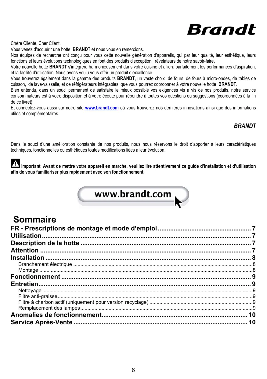 - Prescriptions de montage et mode d’emploi Bruger- og monteringsvejledning Montage- und Gebrauchsanweisung ΟΔΗΓΙΕΣ ΣΥΝΑΡΜΟΛΟΓΗΣΗΣ ΚΑΙ ΧΡΗΣΗΣ Instruction on mounting and use Istruzioni di montaggio e d'uso Montagevoorschriften en gebruiksaanwijzingen Monterings- och bruksanvisningar Hotte aspirante Emhætte Dunstabzugshaube Αποροφητήρας Cooker Hood Cappa aspirante Afzuigkap Köksfläkt Chère Cliente, Cher Client, Vous venez d'acquérir une hotte BRANDT et nous vous en remercions. Nos équipes de recherche ont conçu pour vous cette nouvelle génération d'appareils, qui par leur qualité, leur esthétique, leurs fonctions et leurs évolutions technologiques en font des produits d'exception, révélateurs de notre savoir-faire. Votre nouvelle hotte BRANDT s'intègrera harmonieusement dans votre cuisine et alliera parfaitement les performances d’aspiration, et la facilité d’utilisation. Nous avons voulu vous offrir un produit d’excellence. Vous trouverez également dans la gamme des produits BRANDT, un vaste choix de fours, de fours à micro-ondes, de tables de cuisson, de lave-vaisselle, et de réfrigérateurs intégrables, que vous pourrez coordonner à votre nouvelle hotte BRANDT. Bien entendu, dans un souci permanent de satisfaire le mieux possible vos exigences vis à vis de nos produits, notre service consommateurs est à votre disposition et à votre écoute pour répondre à toutes vos questions ou suggestions (coordonnées à la fin de ce livret). Et connectez-vous aussi sur notre site www.brandt.com où vous trouverez nos dernières innovations ainsi que des informations utiles et complémentaires. BRANDT Dans le souci d’une amélioration constante de nos produits, nous nous réservons le droit d’apporter à leurs caractéristiques techniques, fonctionnelles ou esthétiques toutes modifications liées à leur évolution. Important: Avant de mettre votre appareil en marche, veuillez lire attentivement ce guide d’installation et d’utilisation afin de vous familiariser plus rapidement avec son fonctionnement. Sommaire FR - Prescriptions de montage et mode d’emploi p. 7