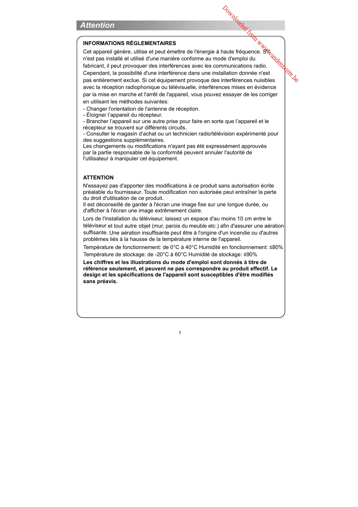 Débranchement La prise mâle est le principal moyen de déconnexion de l'appareil et doit donc rester accessible en permanence. ATTENTION Cet appareil est exclusivement destiné à une utilisation domestique et ne doit pas être utilisé d'une autre manière ou pour d'autres applications, notamment dans un environnement non-domestique ou commercial. Si le fil est endommagé, il doit être remplacé par le fabricant, son agent de réparation ou une personne de qualification équivalente, pour des raisons de sécurité. L’appareil ne doit pas être exposé à des éclaboussures, ni à des gouttes d'eau. Ne placez pas d’objet contenant un liquide (ex: vase) sur l'appareil. Aucune source de flamme nue (ex:bougie allumée) ne doit être placée sur l’appareil. Veillez à ce que les ouvertures de ventilation ne soient jamais obstruées par quelque objet que ce soit (ex: journaux, nappe, rideaux etc.). ATTENTION: Afin d'éviter tout risque de blessure, cet appareil doit être solidement fixé au sol ou au mur de la manière indiquée dans la notice d'installation. Cet appareil ne convient pas pour une utilisation sous un climat tropical.