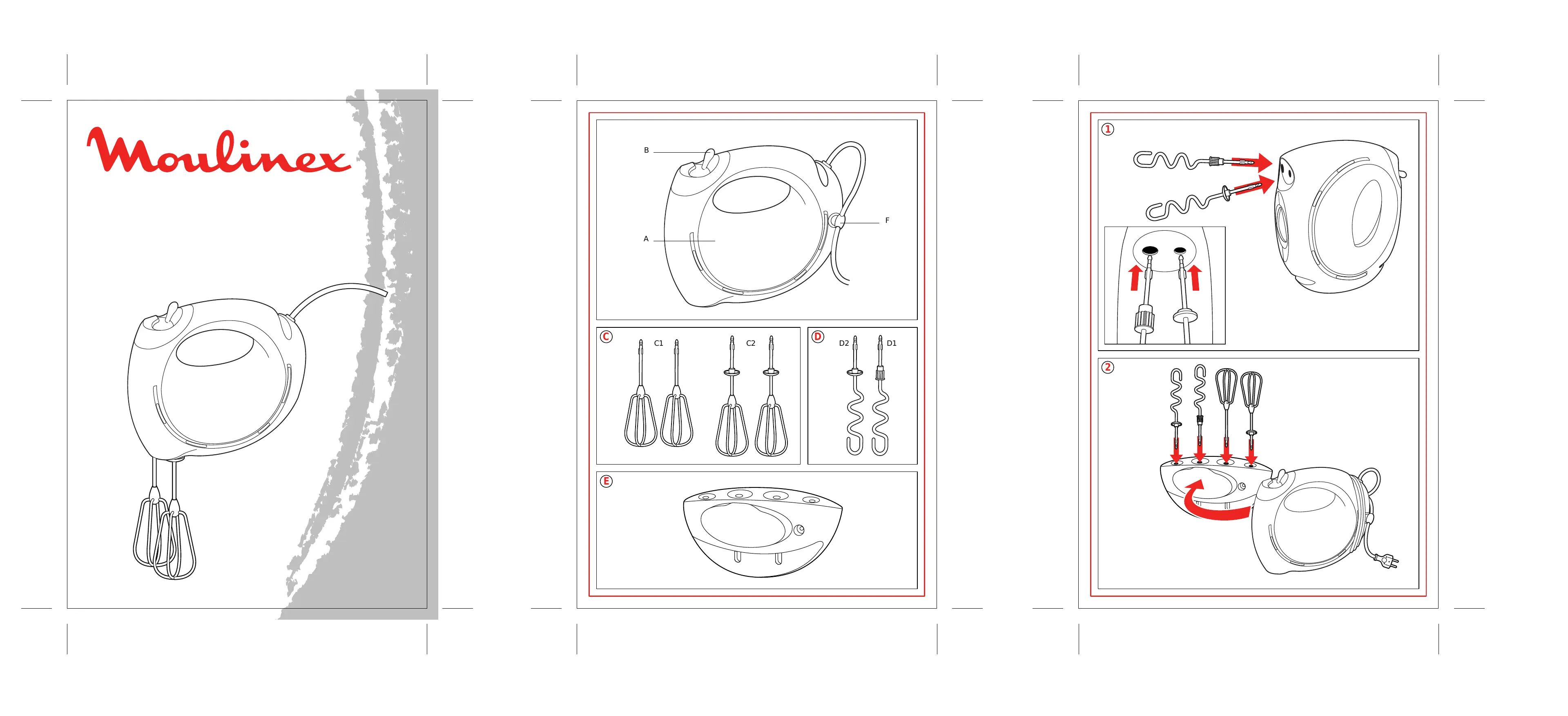 Nous vous remercions d’avoir choisi un appareil de la gamme Moulinex. Votre batteur Easy Max vous offre des avantages exclusifs: . “Easy*” : un bouton de commande unique pour toutes les opérations . “Max” : une forme optimisée des fouets pour l’émulsion des pâtes légères (*) : facile Description Corps de l’appareil Commande “Easy” Accessoires (selon modèles) 1 jeu de fouets “Max” (C1 ou C2) 1 jeu de malaxeurs D1 malaxeur droit D2 malaxeur gauche Support mural et rangement des accessoires Ventouse pour rangement du cordon Conseils de sécurité - Placez l’appareil hors d’atteinte des enfants. - Vérifiez que la tension d’alimentation indiquée sur la plaque signalétique de l’appareil correspond bien à celle de votre installation électrique. - Toute erreur de branchement ou de manipulation annule la garantie. - Votre appareil est uniquement à usage domestique. - Ne touchez jamais les pièces en mouvement. - N’utilisez que des accessoires Moulinex. - Ne laissez rien pendre au-dessus des accessoires en fonctionnement. - Débranchez l’appareil avant toutes manipulations (montage et démontage des accessoires), après utilisation, avant le nettoyage et en cas de dysfonctionnement. - Ne tirez pas sur le cordon d’alimentation pour débrancher l’appareil. - Ne laissez pas pendre le cordon d’alimentation à proximité d’une source de chaleur ou à portée de mains des enfants. - Ne mettez jamais le corps de l’appareil dans l’eau, ni sous l’eau courante. - Si le câble d’alimentation ou la fiche sont endommagés, n'utilisez pas votre appareil. Afin d'éviter tout danger, faites-les obligatoirement remplacer par un centre service agréé Moulinex (voir liste dans le livret «Moulinex Service»). - Ne démontez pas l’appareil. Utilisation - Avant la première utilisation, nettoyez vos accessoires à l’eau savonneuse. Rincez et séchez soigneusement. Avec les fouets (C), vous pouvez réaliser des préparations légères : mayonnaise, blancs en neige, sauce, pâtes à cake et à crêpes... Avec les malaxeurs (D), vous pouvez pétrir des pâtes lourdes : tarte, brioche, pain... . Utilisation - Vérifiez que la commande (B) est en position «0». . Suivant la nature de votre préparation : - Insérez les fouets (C1 ou C2) sur le corps de l’appareil (A).