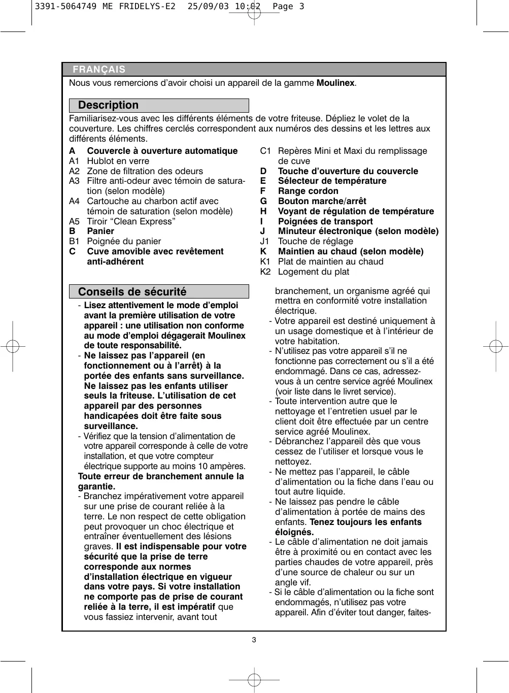 25/09/03 10:02 Page 3 FRANÇAIS Nous vous remercions d’avoir choisi un appareil de la gamme Moulinex. Description Familiarisez-vous avec les différents éléments de votre friteuse. Dépliez le volet de la couverture. Les chiffres cerclés correspondent aux numéros des dessins et les lettres aux différents éléments. C1 Repères Mini et Maxi du remplissage A Couvercle à ouverture automatique de cuve A1 Hublot en verre D Touche d’ouverture du couvercle A2 Zone de filtration des odeurs E Sélecteur de température A3 Filtre anti-odeur avec témoin de saturaF Range cordon tion (selon modèle) G Bouton marche/arrêt A4 Cartouche au charbon actif avec H Voyant de régulation de température témoin de saturation (selon modèle) Poignées de transport A5 Tiroir “Clean Express” J Minuteur électronique (selon modèle) B Panier J1 Touche de réglage B1 Poignée du panier K Maintien au chaud (selon modèle) C Cuve amovible avec revêtement K1 Plat de maintien au chaud anti-adhérent K2 Logement du plat Conseils de sécurité branchement, un organisme agréé qui mettra en conformité votre installation électrique. - Votre appareil est destiné uniquement à un usage domestique et à l’intérieur de votre habitation. - N’utilisez pas votre appareil s’il ne fonctionne pas correctement ou s’il a été endommagé. Dans ce cas, adressezvous à un centre service agréé Moulinex (voir liste dans le livret service). - Toute intervention autre que le nettoyage et l’entretien usuel par le client doit être effectuée par un centre service agréé Moulinex. - Débranchez l’appareil dès que vous cessez de l’utiliser et lorsque vous le nettoyez. - Ne mettez pas l’appareil, le câble d’alimentation ou la fiche dans l’eau ou tout autre liquide. - Ne laissez pas pendre le câble d’alimentation à portée de mains des enfants. Tenez toujours les enfants éloignés. - Le câble d’alimentation ne doit jamais être à proximité ou en contact avec les parties chaudes de votre appareil, près d’une source de chaleur ou sur un angle vif. - Si le câble d’alimentation ou la fiche sont endommagés, n’utilisez pas votre appareil. Afin d’éviter tout danger, faites- - Lisez attentivement le mode d’emploi avant la première utilisation de votre appareil : une utilisation non conforme au mode d’emploi dégagerait Moulinex de toute responsabilité. - Ne laissez pas l’appareil (en fonctionnement ou à l’arrêt) à la portée des enfants sans surveillance. Ne laissez pas les enfants utiliser seuls la friteuse. L’utilisation de cet appareil par des personnes handicapées doit être faite sous surveillance. - Vérifiez que la tension d’alimentation de votre appareil corresponde à celle de votre installation, et que votre compteur électrique supporte au moins 10 ampères. Toute erreur de branchement annule la garantie. - Branchez impérativement votre appareil sur une prise de courant reliée à la terre. Le non respect de cette obligation peut provoquer un choc électrique et entraîner éventuellement des lésions graves. Il est indispensable pour votre sécurité que la prise de terre corresponde aux normes d’installation électrique en vigueur dans votre pays. Si votre installation ne comporte pas de prise de courant reliée à la terre, il est impératif que vous fassiez intervenir, avant tout