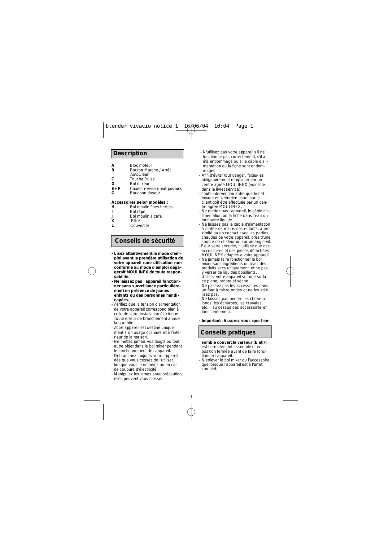 - Lisez attentivement le mode d'emploi avant la première utilisation de votre appliée : une utilisation non conforme au mode d'emploi dégérer MOULINEX de toute responsabilité.