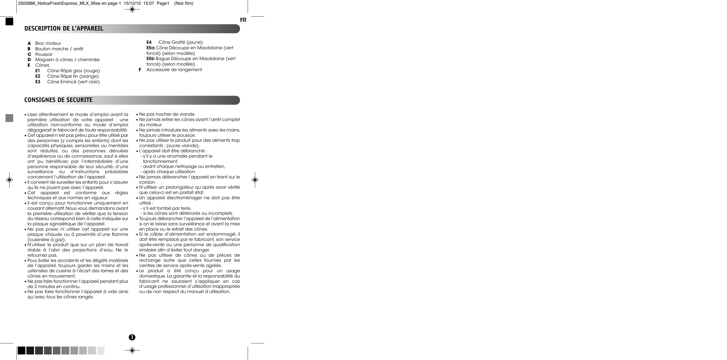 FR DESCRIPTION DE L’APPAREIL A B C D E Bloc moteur Bouton marche / arrêt Poussoir Magasin à cônes / cheminée Cônes E1 Cône Râpé gros (rouge) E2 Cône Râpé fin (orange) E3 Cône Emincé (vert clair)