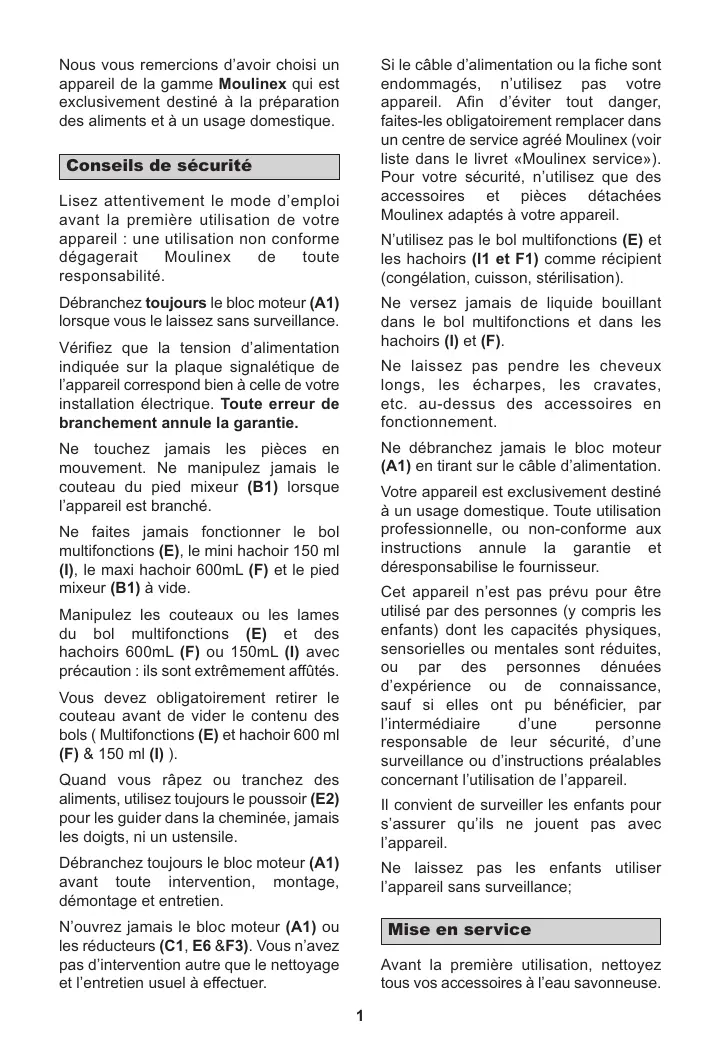 Nous vous remercions d’avoir choisi un appareil de la gamme Moulinex qui est exclusivement destiné à la préparation des aliments et à un usage domestique. Si le câble d’alimentation ou la fiche sont endommagés, n’utilisez pas votre appareil. Afin d’éviter tout danger, faites-les obligatoirement remplacer dans un centre de service agréé Moulinex (voir liste dans le livret «Moulinex service»). Pour votre sécurité, n’utilisez que des accessoires et pièces détachées Moulinex adaptés à votre appareil. Conseils de sécurité Lisez attentivement le mode d’emploi avant la première utilisation de votre appareil : une utilisation non conforme dégagerait Moulinex toute responsabilité. N’utilisez pas le bol multifonctions (E) et les hachoirs (I1 et F1) comme récipient (congélation, cuisson, stérilisation). Débranchez toujours le bloc moteur (A1) lorsque vous le laissez sans surveillance. Ne versez jamais de liquide bouillant dans le bol multifonctions et dans les hachoirs (I) et (F). Vérifiez que la tension d’alimentation indiquée sur la plaque signalétique de l’appareil correspond bien à celle de votre installation électrique. Toute erreur de branchement annule la garantie. Ne laissez pas pendre les cheveux longs, les écharpes, les cravates, etc. au-dessus des accessoires en fonctionnement. Ne débranchez jamais le bloc moteur (A1) en tirant sur le câble d’alimentation. Ne touchez jamais les pièces en mouvement. Ne manipulez jamais le couteau du pied mixeur (B1) lorsque l’appareil est branché. Votre appareil est exclusivement destiné à un usage domestique. Toute utilisation professionnelle, ou non-conforme aux instructions annule la garantie et déresponsabilise le fournisseur. Ne faites jamais fonctionner le bol multifonctions (E), le mini hachoir 150 ml (I), le maxi hachoir 600mL (F) et le pied mixeur (B1) à vide. Cet appareil n’est pas prévu pour être utilisé par des personnes (y compris les enfants) dont les capacités physiques, sensorielles ou mentales sont réduites, ou par des personnes dénuées d’expérience ou de connaissance, sauf si elles ont pu bénéficier, par l’intermédiaire d’une personne responsable de leur sécurité, d’une surveillance ou d’instructions préalables concernant l’utilisation de l’appareil. Manipulez les couteaux ou les lames du bol multifonctions (E) et des hachoirs 600mL (F) ou 150mL (I) avec précaution : ils sont extrêmement affûtés. Vous devez obligatoirement retirer le couteau avant de vider le contenu des bols ( Multifonctions (E) et hachoir 600 ml (F) & 150 ml (I) ). Quand vous râpez ou tranchez des aliments, utilisez toujours le poussoir (E2) pour les guider dans la cheminée, jamais les doigts, ni un ustensile. Il convient de surveiller les enfants pour s’assurer qu’ils ne jouent pas avec l’appareil. Débranchez toujours le bloc moteur (A1) avant toute intervention, montage, démontage et entretien. N’ouvrez jamais le bloc moteur (A1) ou les réducteurs (C1, E6 &F3). Vous n’avez pas d’intervention autre que le nettoyage et l’entretien usuel à effectuer. Ne laissez pas les enfants utiliser l’appareil sans surveillance; Mise en service