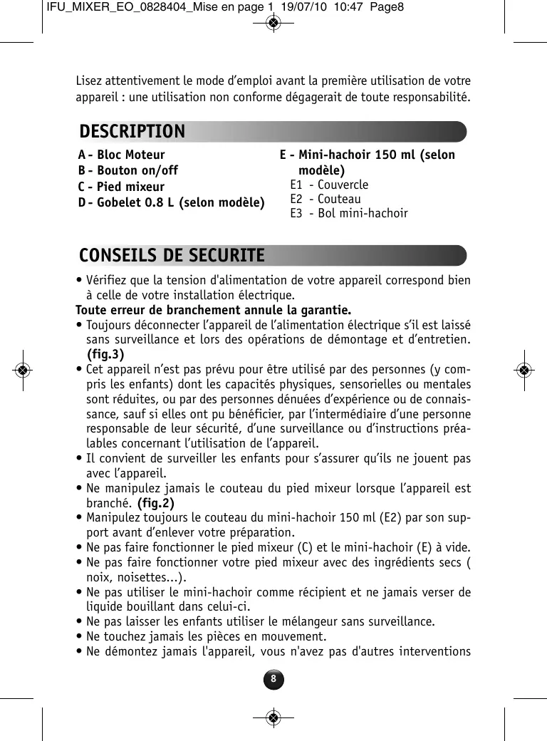 IFU_MIXER_EO_0828404_Mise en page 1 19/07/10 10:47 Page5 IFU_MIXER_EO_0828404_Mise en page 1 19/07/10 10:47 Page6 IFU_MIXER_EO_0828404_Mise en page 1 19/07/10 10:47 Page7 IFU_MIXER_EO_0828404_Mise en page 1 19/07/10 10:47 Page8 Lisez attentivement le mode d’emploi avant la première utilisation de votre appareil : une utilisation non conforme dégagerait de toute responsabilité. DESCRIPTION A - Bloc Moteur B - Bouton on/off C - Pied mixeur D - Gobelet 0.8 L (selon modèle) E - Mini-hachoir 150 ml (selon modèle) E1 - Couvercle E2 - Couteau E3 - Bol mini-hachoir