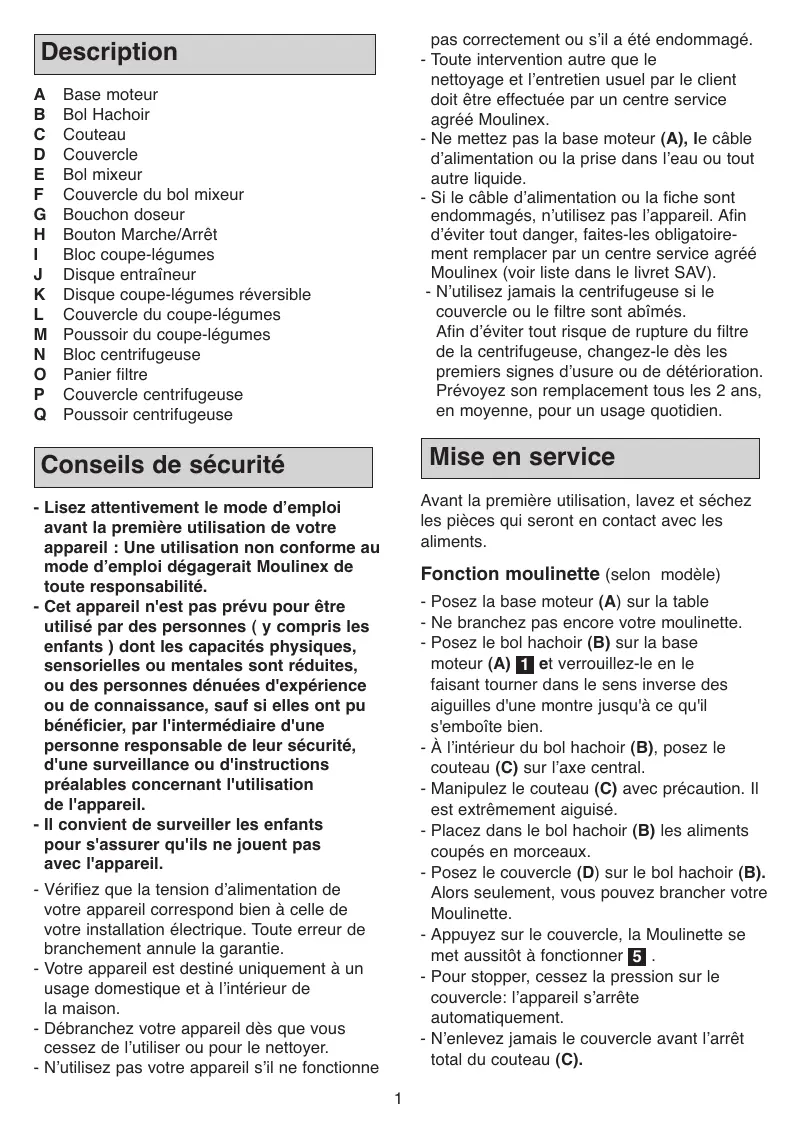 pas correctement ou sʼil a été endommagé. - Toute intervention autre que le nettoyage et lʼentretien usuel par le client doit être effectuée par un centre service agréé Moulinex. - Ne mettez pas la base moteur (A), le câble dʼalimentation ou la prise dans lʼeau ou tout autre liquide. - Si le câble dʼalimentation ou la fiche sont endommagés, nʼutilisez pas lʼappareil. Afin dʼéviter tout danger, faites-les obligatoirement remplacer par un centre service agréé Moulinex (voir liste dans le livret SAV). - Nʼutilisez jamais la centrifugeuse si le couvercle ou le filtre sont abîmés. Afin dʼéviter tout risque de rupture du filtre de la centrifugeuse, changez-le dès les premiers signes dʼusure ou de détérioration. Prévoyez son remplacement tous les 2 ans, en moyenne, pour un usage quotidien.