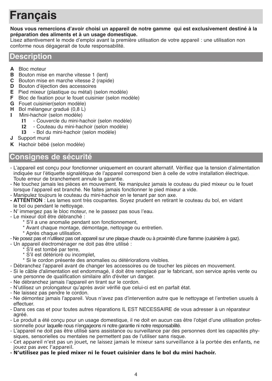 Français Nous vous remercions d’avoir choisi un appareil de notre gamme qui est exclusivement destiné à la préparation des aliments et à un usage domestique. Lisez attentivement le mode d’emploi avant la première utilisation de votre appareil : une utilisation non conforme nous dégagerait de toute responsabilité. Bloc moteur Bouton mise en marche vitesse 1 (lent) Bouton mise en marche vitesse 2 (rapide) Bouton d’éjection des accessoires Pied mixeur (plastique ou métal) (selon modèle) Bloc de fixation pour le fouet cuisinier (selon modèle) Fouet cuisinier(selon modèle) Bol mélangeur gradué (0,8 L) Mini-hachoir (selon modèle) I1 - Couvercle du mini-hachoir (selon modèle) I2 - Couteau du mini-hachoir (selon modèle) I3 - Bol du mini-hachoir (selon modèle) J Support mural K Hachoir bébé (selon modèle) - Cet appareil est conforme aux règles techniques et aux normes en vigueur. Consignes de sécurité - L’appareil est conçu pour fonctionner uniquement en courant alternatif. Vérifiez que la tension d’alimentation indiquée sur l’étiquette signalétique de l’appareil correspond bien à celle de votre installation électrique. Toute erreur de branchement annule la garantie. - Ne touchez jamais les pièces en mouvement. Ne manipulez jamais le couteau du pied mixeur ou le fouet lorsque l’appareil est branché. Ne faites jamais fonctionner le pied mixeur a vide. - Manipulez toujours le couteau du mini-hachoir en le tenant par son axe. - ATTENTION : Les lames sont très coupantes. Soyez prudent en retirant le couteau du bol, en vidant le bol ou pendant le nettoyage. - N’ immergez pas le bloc moteur, ne le passez pas sous l’eau. - Le mixeur doit être débranché :