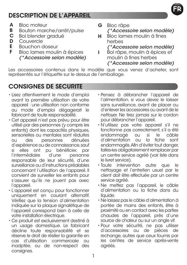(F)*, (G)* ou (H)* d'un quart de tour vers la gauche (fig 4). 5- Branchez l'appareil et mettez le bouton M/A (B) sur la position "1" ou donnez quelques impulsions sur la position "pulse". Tenir le bol (I)* pendant le fonctionnement. Pour arrêter le blender, ramenez le bouton M/A (B) sur la position “0”. 6- Déverrouillez l'accessoire en le tournant d'un quart de tour dans le sens inverse des aiguilles d'une montre. Retirez l'accessoire assemblé (F)*, (G)* ou (H)* du bloc moteur. Retournez-le sur le plan de travail avant de déverrouiller le bloc lames (F)*, (G)* ou (H)* du bol (I)*en procédant à l'inverse de la mise en place.Vous pouvez alors récupérer la préparation dans le bol.