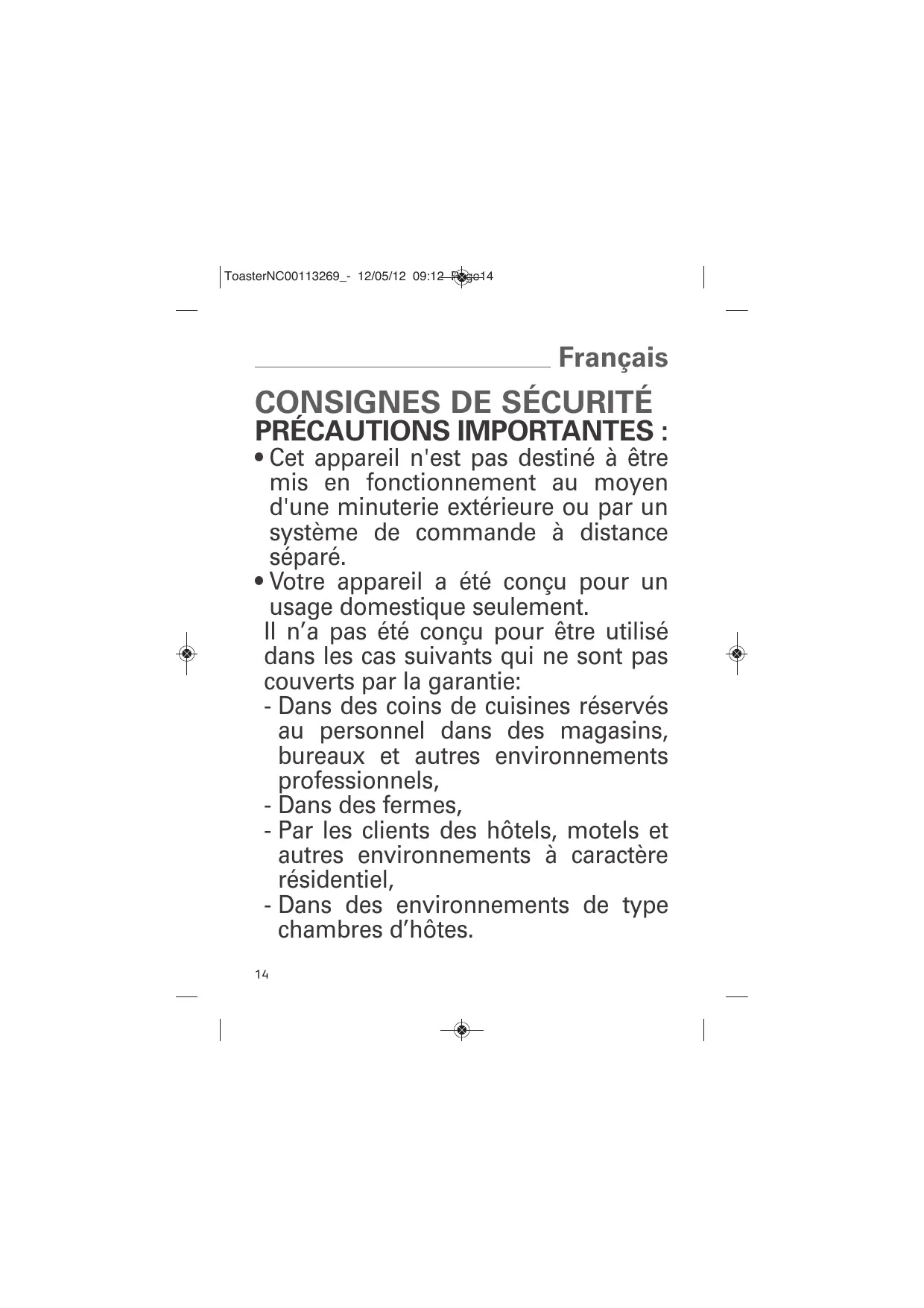 (Directives Basse Tension, compatibilité Electromagnétique, matériaux en contact des aliments, environnement...). • Conformément à l’avis de la CSC du 2/12/04, ce produit est équipé d’une conception mécanique permettant de désolidariser le système d’éjection du pain de l’élément de coupure de l’alimentation électrique. • Vérifiez que la tension du réseau correspond bien à celle indiquée sur l’appareil (courant alternatif seulement). • Compte-tenu de la diversité des normes en vigueur, si l’appareil est utilisé dans un pays différent de celui où il a été acheté, faites-le vérifier par une station service agréée (voir liste jointe). • Assurez-vous que l’installation électrique est conforme aux normes en vigueur et suffisante pour alimenter un appareil de cette puissance. • Branchez toujours l’appareil sur une prise reliée à la terre. • N’utilisez qu’une rallonge en bon état, avec une prise de terre reliée à la terre, et avec un fil conducteur de section au moins égale au fil fourni avec le produit. PRÉVENTION DES ACCIDENTS DOMESTIQUES Lors de l’utilisation d’appareils électriques, un certain nombre de règles élémentaires doivent être respectées, en particulier les suivantes : À FAIRE • Lisez entièrement le mode d’emploi et suivez attentivement les instructions d’utilisation. • L’appareil doit être exclusivement en position debout, jamais couché, incliné ou à l’envers pour son fonctionnement. • Avant chaque utilisation, vérifiez que la trappe ramasse-miettes est bien positionnée dans son logement. • Enlevez régulièrement les miettes par la trappe. • Le bouton de commande du chariot doit être dans la position haute quand vous branchez ou débranchez votre appareil. • Débranchez l’appareil quand il ne sert pas et avant de le nettoyer. Attendre qu’il refroidisse pour le nettoyer ou avant de le ranger. • En fin de cycle, si les tranches de pain restaient coincées entre les grilles, débranchez, et attendez que l’appareil refroidisse avant de retirer le pain. • Débranchez l’appareil si une anomalie de fonctionnement se produisait. • Utilisez un plan de travail stable à l’abri des projections d’eau et en aucun cas dans une niche de cuisine intégrée. À NE PAS FAIRE • Ne rangez pas le cordon ou la prise dans l’appareil entre les grilles. • Ne débranchez pas l’appareil en tirant sur le cordon. • Ne portez pas ou ne déplacez pas l’appareil pendant l’utilisation. • Ne laissez jamais l’appareil fonctionner sans surveillance et particulièrement à chaque premier grillage ou changement de réglage. • N’utilisez pas l’appareil pour tout autre usage que celui pour lequel il a été conçu. • Ne touchez pas les parties métalliques ou chaudes de l’appareil en cours d’utilisation. • N’utilisez pas ou n’introduisez pas dans le grille-pain d’ustensiles en métal qui pourraient provoquer des courts-circuits (cuillère, couteau…). • N’ajoutez pas au grille-pain des accessoires qui ne sont pas recommandés par le fabricant car cela peut être dangereux. • Afin d’éviter les chocs électriques, ne plongez pas dans l’eau le fil électrique, la prise de courant ou tout l’appareil. • Ne grillez pas de pains susceptibles de fondre (avec glaçage) ou de couler dans le grille-pain, ne grillez pas de petits morceaux de pain ou croûtons, cela pourrait causer des dommages ou un risque de feu.