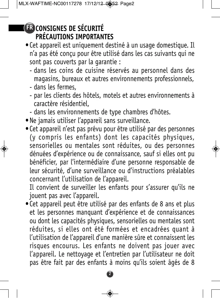 PRÉCAUTIONS IMPORTANTES • Cet appareil est uniquement destiné à un usage domestique. Il n’a pas été conçu pour être utilisé dans les cas suivants qui ne sont pas couverts par la garantie : - dans les coins de cuisine réservés au personnel dans des magasins, bureaux et autres environnements professionnels, - dans les fermes, - par les clients des hôtels, motels et autres environnements à caractère résidentiel, - dans les environnements de type chambres d’hôtes. • Ne jamais utiliser l’appareil sans surveillance. • Cet appareil n’est pas prévu pour être utilisé par des personnes (y compris les enfants) dont les capacités physiques, sensorielles ou mentales sont réduites, ou des personnes dénuées d’expérience ou de connaissance, sauf si elles ont pu bénéficier, par l’intermédiaire d’une personne responsable de leur sécurité, d’une surveillance ou d’instructions préalables concernant l’utilisation de l’appareil. Il convient de surveiller les enfants pour s’assurer qu’ils ne jouent pas avec l’appareil. • Cet appareil peut être utilisé par des enfants de 8 ans et plus et les personnes manquant d’expérience et de connaissances ou dont les capacités physiques, sensorielles ou mentales sont réduites, si elles ont été formées et encadrées quant à l’utilisation de l’appareil d’une manière sûre et connaissent les risques encourus. Les enfants ne doivent pas jouer avec l’appareil. Le nettoyage et l’entretien par l’utilisateur ne doit pas être fait par des enfants à moins qu’ils soient âgés de 8 2