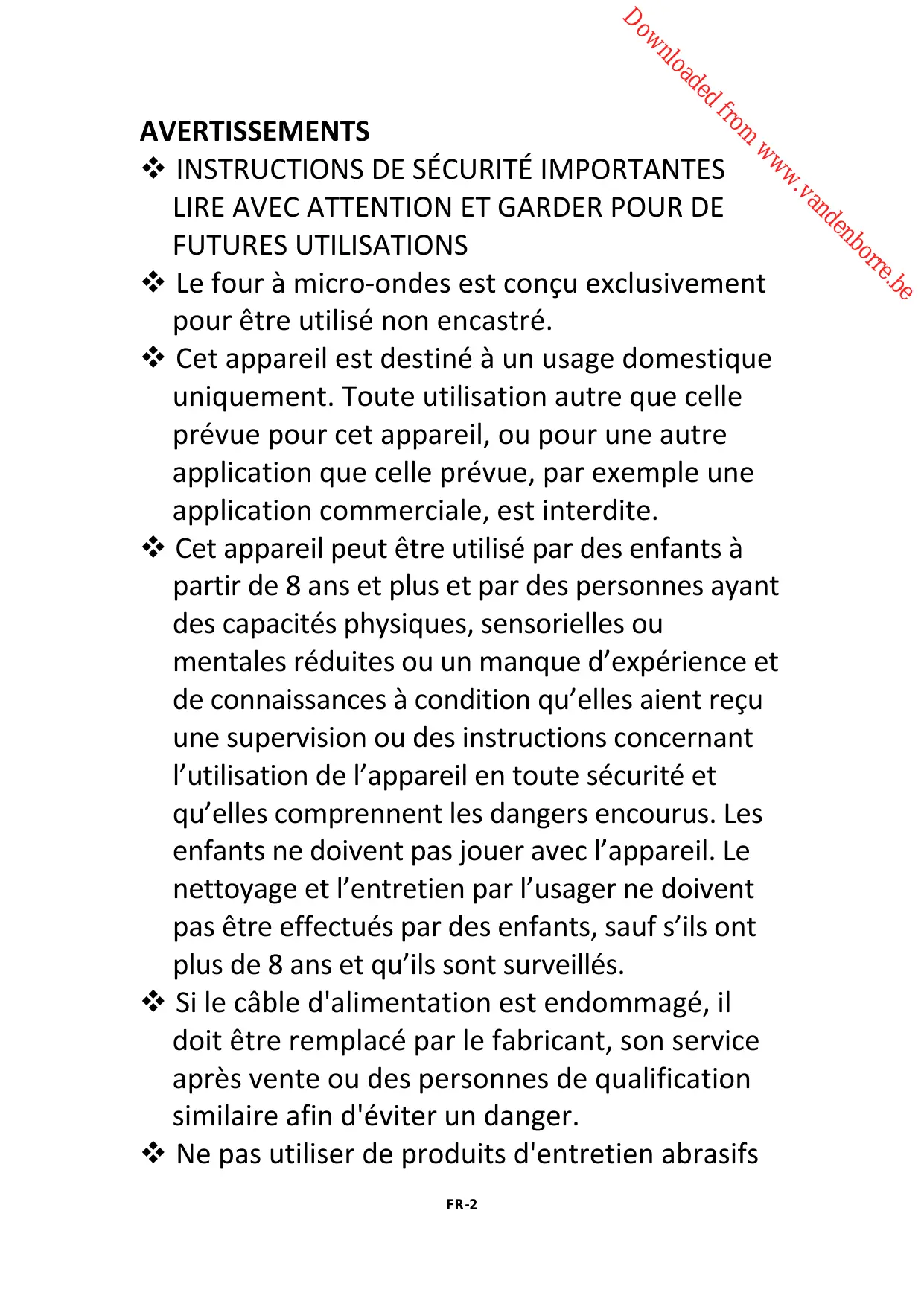 LIRE AVEC ATTENTION ET GARDER POUR DE FUTURES UTILISATIONS Le four à micro‐ondes est conçu exclusivement pour être utilisé non encastré. Cet appareil est destiné à un usage domestique uniquement. Toute utilisation autre que celle prévue pour cet appareil, ou pour une autre application que celle prévue, par exemple une application commerciale, est interdite. Cet appareil peut être utilisé par des enfants à partir de 8 ans et plus et par des personnes ayant des capacités physiques, sensorielles ou mentales réduites ou un manque d’expérience et de connaissances à condition qu’elles aient reçu une supervision ou des instructions concernant l’utilisation de l’appareil en toute sécurité et qu’elles comprennent les dangers encourus. Les enfants ne doivent pas jouer avec l’appareil. Le nettoyage et l’entretien par l’usager ne doivent pas être effectués par des enfants, sauf s’ils ont plus de 8 ans et qu’ils sont surveillés. Si le câble d'alimentation est endommagé, il doit être remplacé par le fabricant, son service après vente ou des personnes de qualification similaire afin d'éviter un danger. Ne pas utiliser de produits d'entretien abrasifs