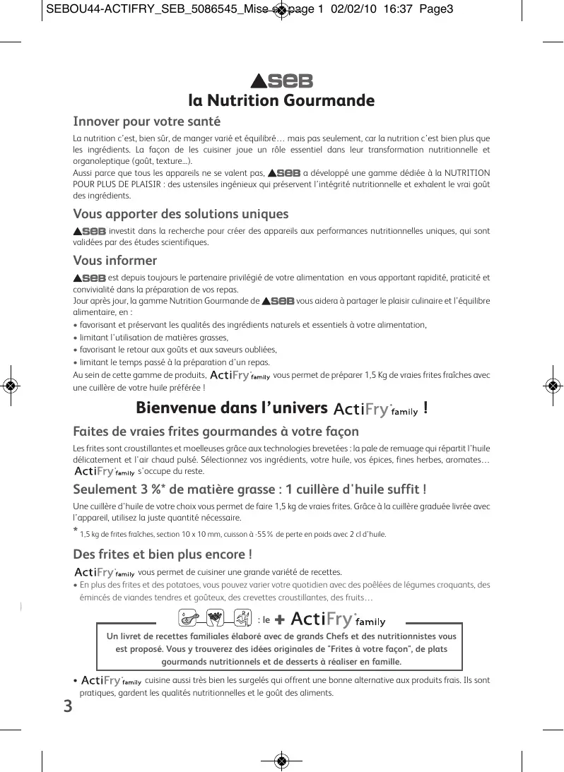 SEBOU44-ACTIFRY_SEB_5086545_Mise en page 1 02/02/10 16:37 Page3 la Nutrition Gourmande Innover pour votre santé La nutrition c’est, bien sûr, de manger varié et équilibré… mais pas seulement, car la nutrition c’est bien plus que les ingrédients. La façon de les cuisiner joue un rôle essentiel dans leur transformation nutritionnelle et organoleptique (goût, texture...). Aussi parce que tous les appareils ne se valent pas, a développé une gamme dédiée à la NUTRITION POUR PLUS DE PLAISIR : des ustensiles ingénieux qui préservent l’intégrité nutritionnelle et exhalent le vrai goût des ingrédients. Vous apporter des solutions uniques investit dans la recherche pour créer des appareils aux performances nutritionnelles uniques, qui sont validées par des études scientifiques. Vous informer est depuis toujours le partenaire privilégié de votre alimentation en vous apportant rapidité, praticité et convivialité dans la préparation de vos repas. Jour après jour, la gamme Nutrition Gourmande de vous aidera à partager le plaisir culinaire et l’équilibre alimentaire, en :