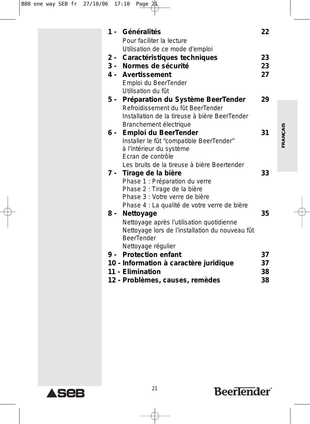 Retrouvez gratuitement la notice de l'appareil BEERTENDER B80 SEB au format PDF.