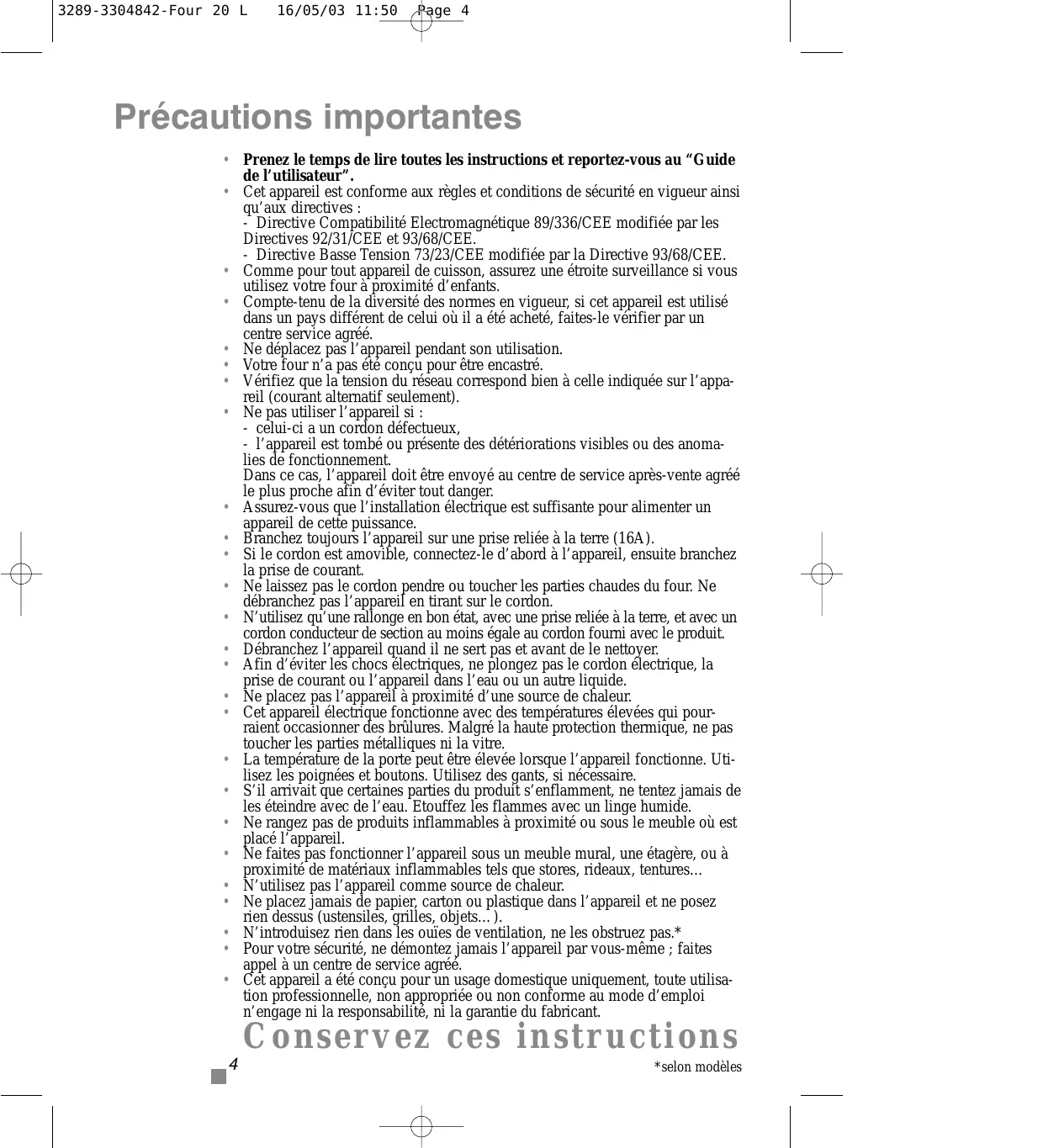 3289-3304842-Four 20 L 16/05/03 11:50 Page 4 Précautions importantes