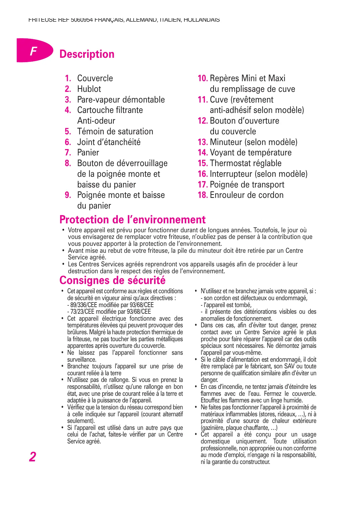 11. Cuve (revêtement anti-adhésif selon modèle) 12. Bouton d’ouverture du couvercle 13. Minuteur (selon modèle) 14. Voyant de température • Votre appareil est prévu pour fonctionner durant de longues années. Toutefois, le jour où vous envisagerez de remplacer votre friteuse, n’oubliez pas de penser à la contribution que vous pouvez apporter à la protection de l’environnement. • Avant mise au rebut de votre friteuse, la pile du minuteur doit être retirée par un Centre Service agréé. • Les Centres Services agréés reprendront vos appareils usagés afin de procéder à leur destruction dans le respect des règles de l’environnement.