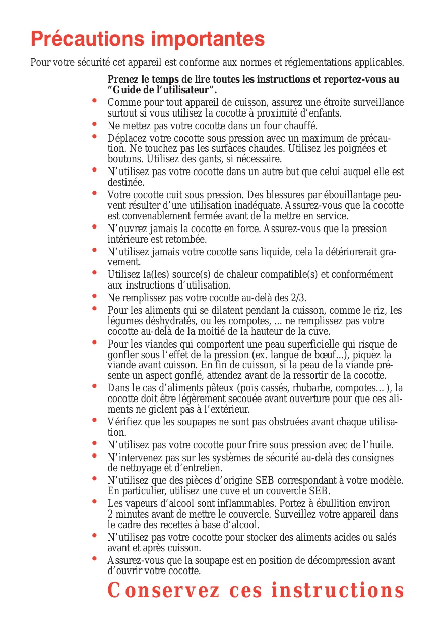 Comme pour tout appareil de cuisson, assurez une étroite surveillance surtout si vous utilisez la cocotte à proximité d’enfants. Ne mettez pas votre cocotte dans un four chauffé. Déplacez votre cocotte sous pression avec un maximum de précaution. Ne touchez pas les surfaces chaudes. Utilisez les poignées et boutons. Utilisez des gants, si nécessaire. N’utilisez pas votre cocotte dans un autre but que celui auquel elle est destinée. Votre cocotte cuit sous pression. Des blessures par ébouillantage peuvent résulter d’une utilisation inadéquate. Assurez-vous que la cocotte est convenablement fermée avant de la mettre en service. N’ouvrez jamais la cocotte en force. Assurez-vous que la pression intérieure est retombée. N’utilisez jamais votre cocotte sans liquide, cela la détériorerait gravement. Utilisez la(les) source(s) de chaleur compatible(s) et conformément aux instructions d’utilisation. Ne remplissez pas votre cocotte au-delà des 2/3. Pour les aliments qui se dilatent pendant la cuisson, comme le riz, les légumes déshydratés, ou les compotes, ... ne remplissez pas votre cocotte au-delà de la moitié de la hauteur de la cuve. Pour les viandes qui comportent une peau superficielle qui risque de gonfler sous l’effet de la pression (ex. langue de bœuf...), piquez la viande avant cuisson. En fin de cuisson, si la peau de la viande présente un aspect gonflé, attendez avant de la ressortir de la cocotte. Dans le cas d’aliments pâteux (pois cassés, rhubarbe, compotes…), la cocotte doit être légèrement secouée avant ouverture pour que ces aliments ne giclent pas à l’extérieur. Vérifiez que les soupapes ne sont pas obstruées avant chaque utilisation. N’utilisez pas votre cocotte pour frire sous pression avec de l’huile. N’intervenez pas sur les systèmes de sécurité au-delà des consignes de nettoyage et d’entretien. N’utilisez que des pièces d’origine SEB correspondant à votre modèle. En particulier, utilisez une cuve et un couvercle SEB. Les vapeurs d’alcool sont inflammables. Portez à ébullition environ 2 minutes avant de mettre le couvercle. Surveillez votre appareil dans le cadre des recettes à base d’alcool. N’utilisez pas votre cocotte pour stocker des aliments acides ou salés avant et après cuisson. Assurez-vous que la soupape est en position de décompression avant d’ouvrir votre cocotte.