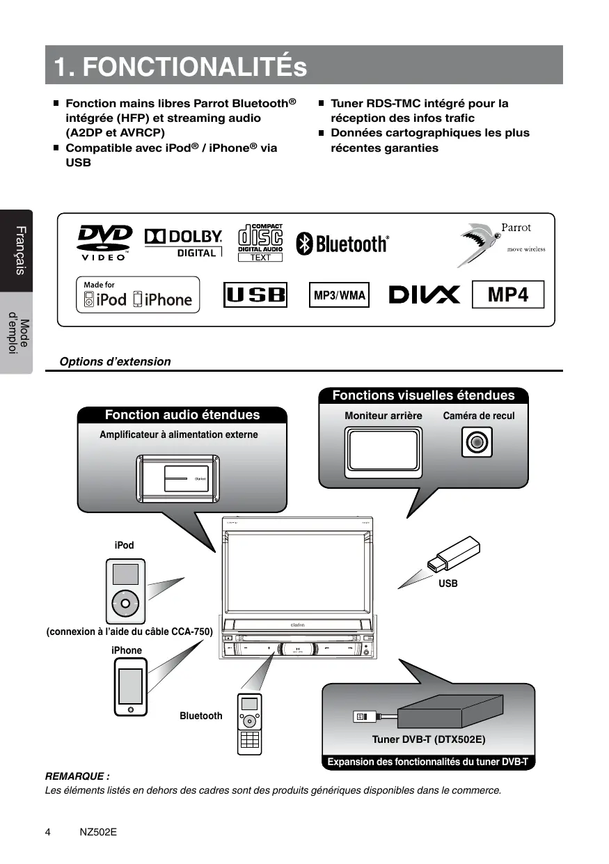 Fonction mains libres Parrot Bluetooth® intégrée (HFP) et streaming audio (A2DP et AVRCP) Compatible avec iPod® / iPhone® via USB Tuner RDS-TMC intégré pour la réception des infos trafic Données cartographiques les plus récentes garanties Français GPS Antenna Black External Microphone Connection EX MIC Mode d’emploi Options d’extension Radio Antenna Fonctions visuelles étendues Fonction audio étendues Moniteur arrière Caméra de recul Amplificateur à alimentation externe iPod Gray Steering Wheel Remote Control Terminal SWI Yellow Black VIDEO OUT (connexion à l’aide du câble CCA-750) iPhone White USB RearZone Monitor Green 2 ZONE OUT BlackBluetooth Red DTV Tuner DVB-T (DTX502E) DVB-T Tuner (DTX501E) Expansion des fonctionnalités du tuner DVB-T Red Line Out REMARQUE : Les éléments listés en dehors des cadresGray sont des produitsFront génériques disponibles dans le commerce. White