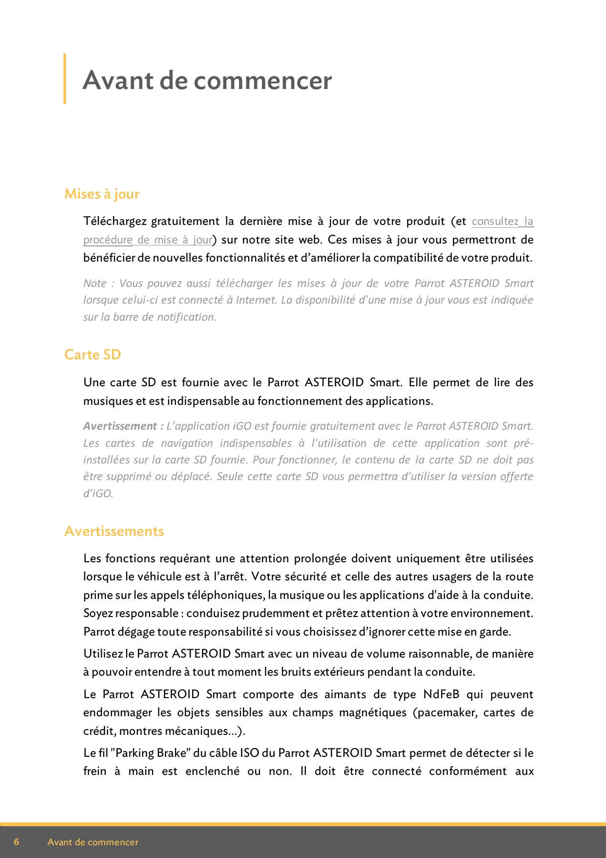 Les cartes de navigation indispensables à l'utilisation de cette application sont préinstallées sur la carte SD fournie. Pour fonctionner, le contenu de la carte SD ne doit pas être supprimé ou déplacé. Seule cette carte SD vous permettra d'utiliser la version offerte d'iGO. Avertissements Les fonctions requérant une attention prolongée doivent uniquement être utilisées lorsque le véhicule est à l’arrêt. Votre sécurité et celle des autres usagers de la route prime sur les appels téléphoniques, la musique ou les applications d'aide à la conduite. Soyez responsable : conduisez prudemment et prêtez attention à votre environnement. Parrot dégage toute responsabilité si vous choisissez d’ignorer cette mise en garde. Utilisez le Parrot ASTEROID Smart avec un niveau de volume raisonnable, de manière à pouvoir entendre à tout moment les bruits extérieurs pendant la conduite. Le Parrot ASTEROID Smart comporte des aimants de type NdFeB qui peuvent endommager les objets sensibles aux champs magnétiques (pacemaker, cartes de crédit, montres mécaniques...). Le fil "Parking Brake" du câble ISO du Parrot ASTEROID Smart permet de détecter si le frein à main est enclenché ou non. Il doit être connecté conformément aux
