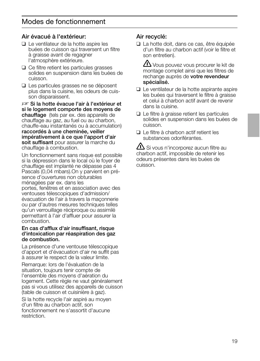 Modes de fonctionnement Air évacué à l'extérieur: Air recyclé: ❑ Le ventilateur de la hotte aspire les buées de cuisson qui traversent un filtre à graisse avant de regagner l'atmosphère extérieure. ❑ Ce filtre retient les particules grasses solides en suspension dans les buées de cuisson. ❑ Les particules grasses ne se déposent plus dans la cuisine, les odeurs de cuisson disparaissent. D Si la hotte évacue l'air à l'extérieur et si le logement comporte des moyens de chauffage (tels par ex. des appareils de chauffage au gaz, au fuel ou au charbon, chauffe-eau instantanés ou à accumulation) raccordés à une cheminée, veiller impérativement à ce que l'apport d'air soit suffisant pour assurer la marche du chauffage à combustion. Un fonctionnement sans risque est possible si la dépression dans le local où le foyer de chauffage est implanté ne dépasse pas 4 Pascals (0,04 mbars).On y parvient en présence d'ouvertures non obturables ménagées par ex. dans les portes, fenêtres et en association avec des ventouses télescopiques d'admission/ évacuation de l'air à travers la maçonnerie ou par d'autres mesures techniques telles qu'un verrouillage réciproque ou assimilé permettant à l'air d'affluer pour assurer la combustion. En cas d'afflux d'air insuffisant, risque d'intoxication par réaspiration des gaz de combustion. La présence d'une ventouse télescopique d'apport et d'évacuation d'air ne suffit pas à assurer le respect de la valeur limite. Remarque: lors de l'évaluation de la situation, toujours tenir compte de l'ensemble des moyens d'aération du logement. Cette règle ne vaut généralement pas si vous utilisez des appareils de cuisson (table de cuisson et cuisinière à gaz). Si la hotte recycle l'air aspiré au moyen d'un filtre au charbon actif, son fonctionnement ne s'assortit d'aucune restriction. ❑ La hotte doit, dans ce cas, être équipée d'un filtre au charbon actif (voir le filtre et son entretien). 몇 Vous pouvez vous procurer le kit de montage complet ainsi que les filtres de rechange auprès de votre revendeur spécialisé. ❑ Le ventilateur de la hotte aspirante aspire les buées qui traversent le filtre à graisse et celui à charbon actif avant de revenir dans la cuisine. ❑ Le filtre à graisse retient les particules solides en suspension dans les buées de cuisson. ❑ Le filtre à charbon actif retient les substances odoriférantes.