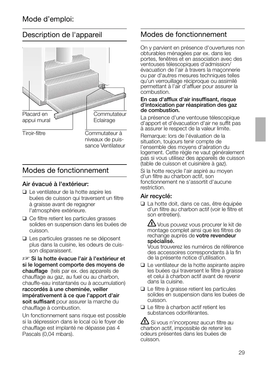 Mode d’emploi: Description de l'appareil Modes de fonctionnement On y parvient en présence d'ouvertures non obturables ménagées par ex. dans les portes, fenêtres et en association avec des ventouses télescopiques d'admission/ évacuation de l'air à travers la maçonnerie ou par d'autres mesures techniques telles qu'un verrouillage réciproque ou assimilé permettant à l'air d'affluer pour assurer la combustion. En cas d'afflux d'air insuffisant, risque d'intoxication par réaspiration des gaz de combustion. La présence d'une ventouse télescopique d'apport et d'évacuation d'air ne suffit pas à assurer le respect de la valeur limite. Remarque: lors de l'évaluation de la situation, toujours tenir compte de l'ensemble des moyens d'aération du logement. Cette règle ne vaut généralement pas si vous utilisez des appareils de cuisson (table de cuisson et cuisinière à gaz). Si la hotte recycle l'air aspiré au moyen d'un filtre au charbon actif, son fonctionnement ne s'assortit d'aucune restriction. Tiroir-filtre Commutateur Eclairage Commutateur à niveaux de puissance Ventilateur Modes de fonctionnement Air évacué à l'extérieur: ❑ Le ventilateur de la hotte aspire les buées de cuisson qui traversent un filtre à graisse avant de regagner l'atmosphère extérieure. ❑ Ce filtre retient les particules grasses solides en suspension dans les buées de cuisson. ❑ Les particules grasses ne se déposent plus dans la cuisine, les odeurs de cuisson disparaissent. D Si la hotte évacue l'air à l'extérieur et si le logement comporte des moyens de chauffage (tels par ex. des appareils de chauffage au gaz, au fuel ou au charbon, chauffe-eau instantanés ou à accumulation) raccordés à une cheminée, veiller impérativement à ce que l'apport d'air soit suffisant pour assurer la marche du chauffage à combustion. Un fonctionnement sans risque est possible si la dépression dans le local où le foyer de chauffage est implanté ne dépasse pas 4 Pascals (0,04 mbars). Air recyclé: ❑ La hotte doit, dans ce cas, être équipée d'un filtre au charbon actif (voir le filtre et son entretien).