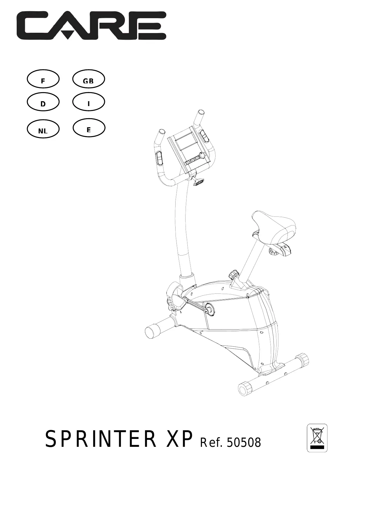 SPRINTER XP Ref. 50508 AVERTISSEMENTS : Sécurité - Lisez et conservez avec précaution ce manuel de l’utilisateur. N’utilisez ce produit que de la manière indiquée. - Cet appareil doit être assemblé et utilisé par des adultes. - Votre appareil est conforme à la norme EN-957 classe H pour une utilisation à domicile, il ne doit pas être utilisé dans une salle de sport ou tout autre lieu public, associatif ou locatif. - Pour une utilisation en toute sécurité une surface stable et plane est nécessaire. Protégez votre revêtement de sol par un tapis. Ne pas utiliser cet appareil dans un endroit humide (piscine, sauna, etc.). - Ne pas laisser jouer les enfants avec l’appareil. La société CARE décline toute responsabilité quant aux dommages qu’ils pourraient subir. Ne pas laisser les enfants à proximité de l’appareil pendant votre entraînement. - CARE décline toute responsabilité en cas de modifications techniques faites par l’utilisateur sur l’un de nos produits. - Poids et taille maximum de l’utilisateur : 130 kg. - Avant de commencer votre entraînement il est primordial de consulter votre médecin pour déterminer le niveau d’intensité de votre programme. Un entraînement excessif ou mal programmé peut nuire à la santé. - Gardez le dos droit lors des exercices. - Il est fortement recommandé de porter une tenue et des chaussures appropriées. - Tenez compte pour les parties réglables des positions maximales. Entretien - Vérifier régulièrement le serrage des éléments de fixation avec les vis et les écrous. Pour garder son niveau de sécurité, votre appareil doit être examiné régulièrement. Il est impératif de remplacer toute pièce défectueuse et de ne plus l’utiliser jusqu’à sa complète réparation. Penser au graissage régulier des pièces mobiles. - La sueur étant très corrosive ne pas laisser celle-ci entrer en contact avec les parties émaillées ou chromées de l'appareil, et particulièrement l'ordinateur, essuyer immédiatement votre appareil après entraînement. Le nettoyage des parties émaillées se fait à l’aide d’une éponge imprégnée d'eau. Tous produits agressifs ou corrosifs sont à proscrire. Garantie : Le châssis est garanti 5 ans. Les pièces d’usures sont garanties 2 ans. La garantie s’applique en utilisation normale par un particulier à domicile. Recyclage : le symbole « poubelle barrée » signifie que ce produit et les piles qu’il peut contenir ne peuvent être jetés avec les déchets domestiques. Ils font l’objet d’un tri sélectif spécifique. Déposez les batteries ainsi que votre produit électronique en fin de vie dans un espace de collecte autorisé afin de les recycler. Cette valorisation de vos déchets électroniques permettra la protection de l’environnement et de votre santé. Important: Read these instructions before using the equipment! Safety