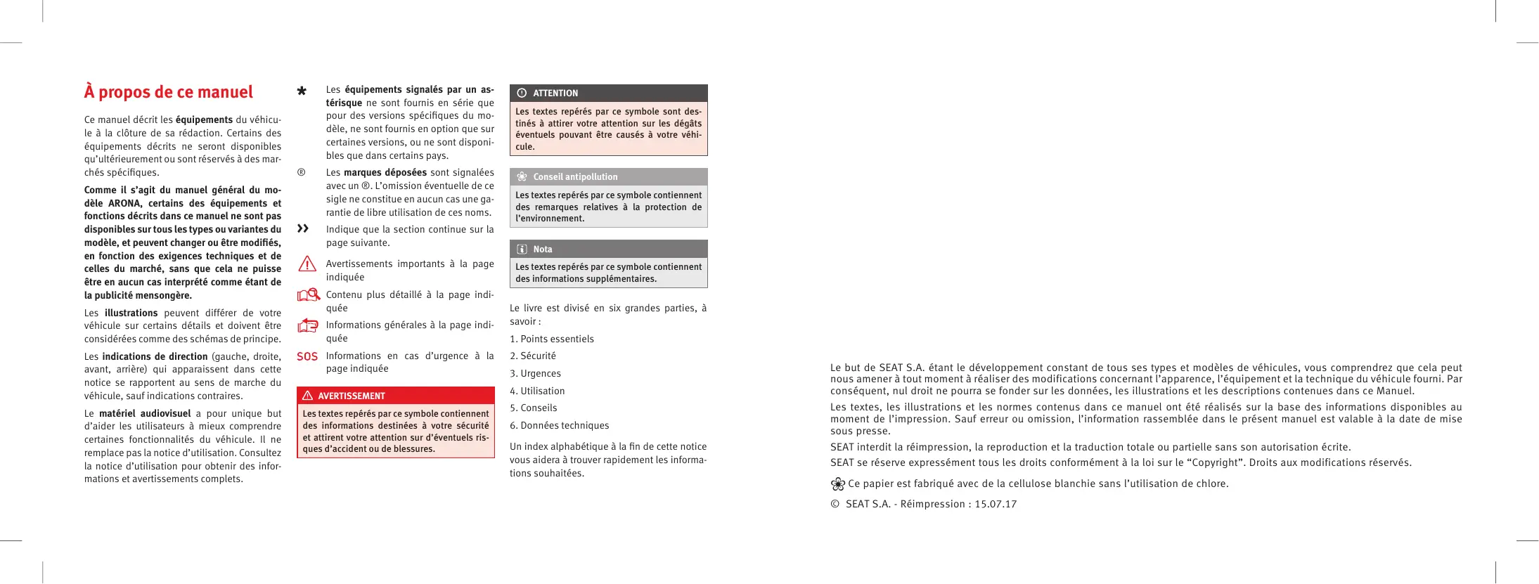 Un index alphabétique à la fin de cette notice vous aidera à trouver rapidement les informations souhaitées. Le but de SEAT S.A. étant le développement constant de tous ses types et modèles de véhicules, vous comprendrez que cela peut nous amener à tout moment à réaliser des modifications concernant l’apparence, l’équipement et la technique du véhicule fourni. Par conséquent, nul droit ne pourra se fonder sur les données, les illustrations et les descriptions contenues dans ce Manuel. Les textes, les illustrations et les normes contenus dans ce manuel ont été réalisés sur la base des informations disponibles au moment de l’impression. Sauf erreur ou omission, l’information rassemblée dans le présent manuel est valable à la date de mise sous presse. SEAT interdit la réimpression, la reproduction et la traduction totale ou partielle sans son autorisation écrite. SEAT se réserve expressément tous les droits conformément à la loi sur le “Copyright”. Droits aux modifications réservés. ❀ Ce papier est fabriqué avec de la cellulose blanchie sans l’utilisation de chlore. © SEAT S.A. - Réimpression : 15.07.17 SEAT recommande