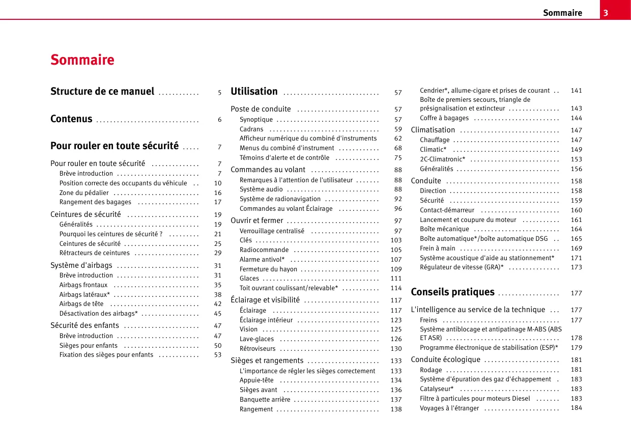 Chauffage . . . . . . . . . . . . . . . . . . . . . . . . . . . . . . . Climatic* . . . . . . . . . . . . . . . . . . . . . . . . . . . . . . . 2C-Climatronic* . . . . . . . . . . . . . . . . . . . . . . . . . . Généralités . . . . . . . . . . . . . . . . . . . . . . . . . . . . . . Conduite . . . . . . . . . . . . . . . . . . . . . . . . . . . . . . . . . Direction . . . . . . . . . . . . . . . . . . . . . . . . . . . . . . . . Sécurité . . . . . . . . . . . . . . . . . . . . . . . . . . . . . . . . Contact-démarreur . . . . . . . . . . . . . . . . . . . . . . . Lancement et coupure du moteur . . . . . . . . . . . Boîte mécanique . . . . . . . . . . . . . . . . . . . . . . . . . Boîte automatique*/boîte automatique DSG . . Frein à main . . . . . . . . . . . . . . . . . . . . . . . . . . . . . Système acoustique d'aide au stationnement* Régulateur de vitesse (GRA)* . . . . . . . . . . . . . . . Conseils pratiques