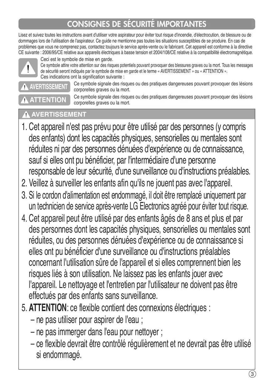 - Ce document contient des instructions importantes pour utiliser et entretenir l'aspirateur en toute sécurité. Pour votre sécurité, veuillez lire en particulier toutes les informations figurant sur les page 3, 4 et 5. Conservez ce manuel d'utilisation à portée de main pour le consulter à tout moment. VWR514SA www.lg.com MFL68480205 Tables des matières Consignes de sécurité importantes p. 3