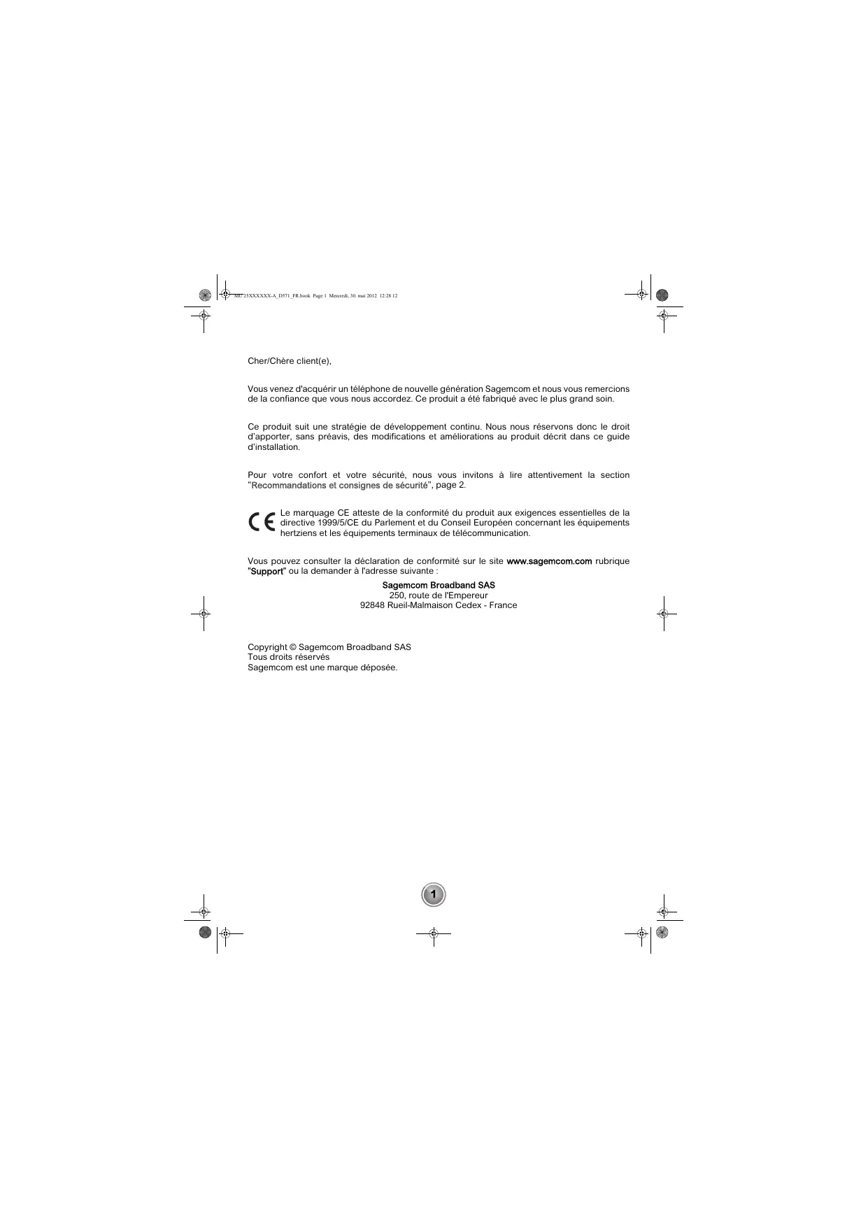 MU 25XXXXXX-A_D571_FR.book Page 3 Mercredi, 30. mai 2012 12:28 12 MU 25XXXXXX-A_D571_FR.book Page 1 Mercredi, 30. mai 2012 12:28 12 Cher/Chère client(e), Vous venez d'acquérir un téléphone de nouvelle génération Sagemcom et nous vous remercions de la confiance que vous nous accordez. Ce produit a été fabriqué avec le plus grand soin. Ce produit suit une stratégie de développement continu. Nous nous réservons donc le droit d’apporter, sans préavis, des modifications et améliorations au produit décrit dans ce guide d’installation. Pour votre confort et votre sécurité, nous vous invitons à lire attentivement la section “Recommandations et consignes de sécurité”, page 2. Le marquage CE atteste de la conformité du produit aux exigences essentielles de la directive 1999/5/CE du Parlement et du Conseil Européen concernant les équipements hertziens et les équipements terminaux de télécommunication. Vous pouvez consulter la déclaration de conformité sur le site www.sagemcom.com rubrique "Support" ou la demander à l'adresse suivante : Sagemcom Broadband SAS 250, route de l'Empereur 92848 Rueil-Malmaison Cedex - France Copyright © Sagemcom Broadband SAS Tous droits réservés Sagemcom est une marque déposée.