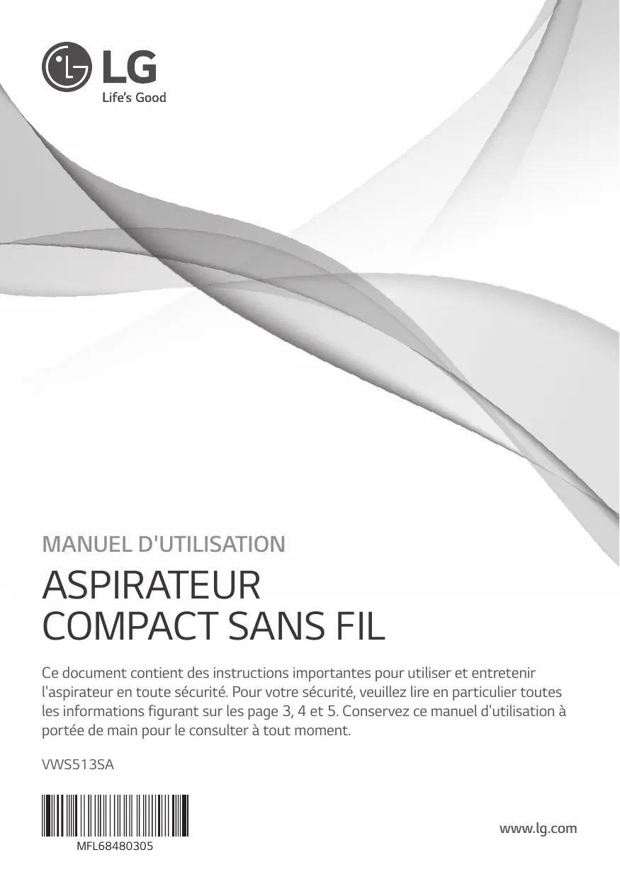 - Ce document contient des instructions importantes pour utiliser et entretenir l'aspirateur en toute sécurité. Pour votre sécurité, veuillez lire en particulier toutes les informations figurant sur les page 3, 4 et 5. Conservez ce manuel d'utilisation à portée de main pour le consulter à tout moment. VWS513SA www.lg.com MFL68480305 Tables des matières Consignes de sécurité importantes p. 3