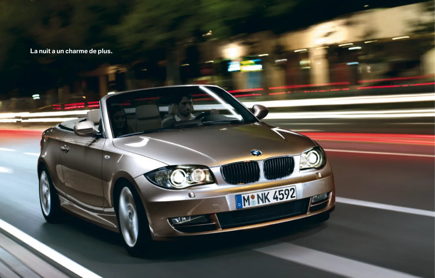 BMW Série 1 Cabriolet www.bmw.fr BMW SÉRIE CABRIOLET. L’ÉTÉ VOUS SUIT PARTOUT. Le plaisir de conduire BMW EfficientDynamics Moins d’émissions. Plus de plaisir. La nuit a un charme de plus. Aussi constante que le plaisir de conduire : la température dans l’habitacle. À l’extérieur, tout n’est que sérénité. À l’intérieur, votre cœur s’emballe. Redécouvrez chaque matin la plus belle des façons de conduire. Investissement maximal. Émissions minimales. Le plaisir de conduire que procure une BMW est le fruit du travail remarquable fourni par nos ingénieurs. Les technologies moteur BMW ont toujours été en avance sur leur temps, car elles dépassent largement le simple cadre des performances. Le programme BMW EfficientDynamics s’inscrit dans cette tradition. Il comprend entre autres le concept visionnaire de propulsion à l’hydrogène, grâce auquel des BMW Série 7 roulent déjà sans émissions nocives. De plus, la technologie BMW ActiveHybrid, combinant intelligemment un moteur à explosion et un moteur électrique, fera bientôt son apparition sur des modèles de série. Par ailleurs, BMW propose d’ores et déjà de série un ensemble de technologies, distinguées à de nombreuses reprises, qui améliorent encore la dynamique tout en réduisant la consommation de carburant et les émissions de CO2. Injection directe haute précision HPI Avec cette nouvelle génération d’injection directe d’essence, les injecteurs piézo-électriques se trouvent à proximité directe des bougies d’allumage et injectent le carburant à une pression élevée avec une extrême précision. Grâce à la position centrale des injecteurs sur les modèles quatre cylindres, le mélange inflammable essence-air ne remplit qu’une partie de la chambre de combustion. Ainsi, à charge partielle, la plage d’utilisation la plus courante, le moteur peut fonctionner efficacement en mélange particulièrement pauvre. Direction à assistance électrique Par rapport aux systèmes de direction hydrauliques conventionnels, elle présente l’avantage de ne consommer de l’énergie que lorsque le conducteur tourne le volant. Lorsque l’angle de braquage reste constant, par exemple à vitesse soutenue sur autoroute, le moteur électrique ne consomme aucune énergie. Fonction d’arrêt et de redémarrage automatique du moteur Les quatre cylindres BMW couplés à une boîte de vitesses manuelle à 6 rapports s’éteignent automatiquement à l’arrêt lorsque le conducteur passe au point mort et relâche la pédale d’embrayage, par exemple à un feu rouge ou dans un embouteillage. Dès que la pédale d’embrayage est enfoncée, le moteur redémarre. Cette mesure réduit nettement la consommation, notamment en ville. Pneumatiques à faible résistance au roulement Pendant que la voiture roule, les pneumatiques se déforment constamment, ce qui coûte de l’énergie et donc du carburant. Les pneumatiques à faible résistance au roulement réduisent cette déformation grâce à leur conception améliorée et à l’utilisation de matériaux spéciaux au niveau des bandes de roulement et des flancs. Indicateur de changement de rapport Passer les rapports à temps est l’un des moyens les plus simples et les plus efficaces d’économiser du carburant. L’indicateur de changement de rapport, uniquement en combinaison avec une boîte de vitesses manuelle à 6 rapports, constitue une aide précieuse en indiquant au conducteur quel rapport engager pour conduire de la manière la plus économique possible. Système de récupération de l’énergie au freinage Sur les véhicules conventionnels, l’alternateur, entraîné par le moteur, alimente continuellement la batterie en énergie électrique, ce qui implique une consommation permanente de carburant. Avec le système de récupération de l’énergie au freinage, la batterie est principalement chargée en décélération, c’est-à-dire dès que le conducteur relâche l’accélérateur. L’énergie cinétique jusqu’alors inutilisée est donc transformée en énergie électrique pendant la décélération puis stockée dans la batterie. L’électricité est ainsi générée sans consommation de carburant. BMW propose d’ores et déjà 24 modèles avec un taux d’émissions de CO2 ne dépassant pas 140 g/km. Et ce n’est qu’un début. Nous poursuivons nos efforts dans la recherche de technologies novatrices pour augmenter encore le plaisir de conduire tout en réduisant les émissions. Certaines mesures BMW EfficientDynamics peuvent être indisponibles en fonction des modèles et des options choisis. Pour plus d’informations sur l’équipement, n’hésitez pas à consulter votre Concessionnaire BMW. BMW EfficientDynamics Moins d’émissions. Plus de plaisir. s Série* o Option* o Projecteurs bi-Xénon. Inclut quatre anneaux lumineux pour fonction d’éclairage diurne et réglage automatique de la portée des projecteurs. Ils améliorent nettement l’éclairage de la chaussée la nuit, par mauvais temps ou par mauvaise visibilité. o Projecteurs directionnels avec éclairage d’intersection. Commandés électromécaniquement, ces projecteurs éclairent chaque virage de façon optimale dès que le conducteur s’y engage. o Feux de route adaptatifs. Ils assistent le conducteur en repassant automatiquement en feux de croisement lorsque d’autres usagers précèdent ou arrivent en sens inverse, ou lorsque l’éclairage de la chaussée est suffisant. s Feux arrière avec conduits lumineux à DEL. Ils soulignent la sportivité de la partie arrière grâce à leurs trois conduits lumineux individuels munis de DEL haute performance. s Projecteurs antibrouillard (représentés ici avec le kit aérodynamique M), intégrés dans la jupe avant, pour plus de sécurité en cas de mauvaise visibilité. Cet équipement comprend des rétroviseurs extérieurs et des buses de lave-glace chauffants. Non disponible sur 135i. o Kit 